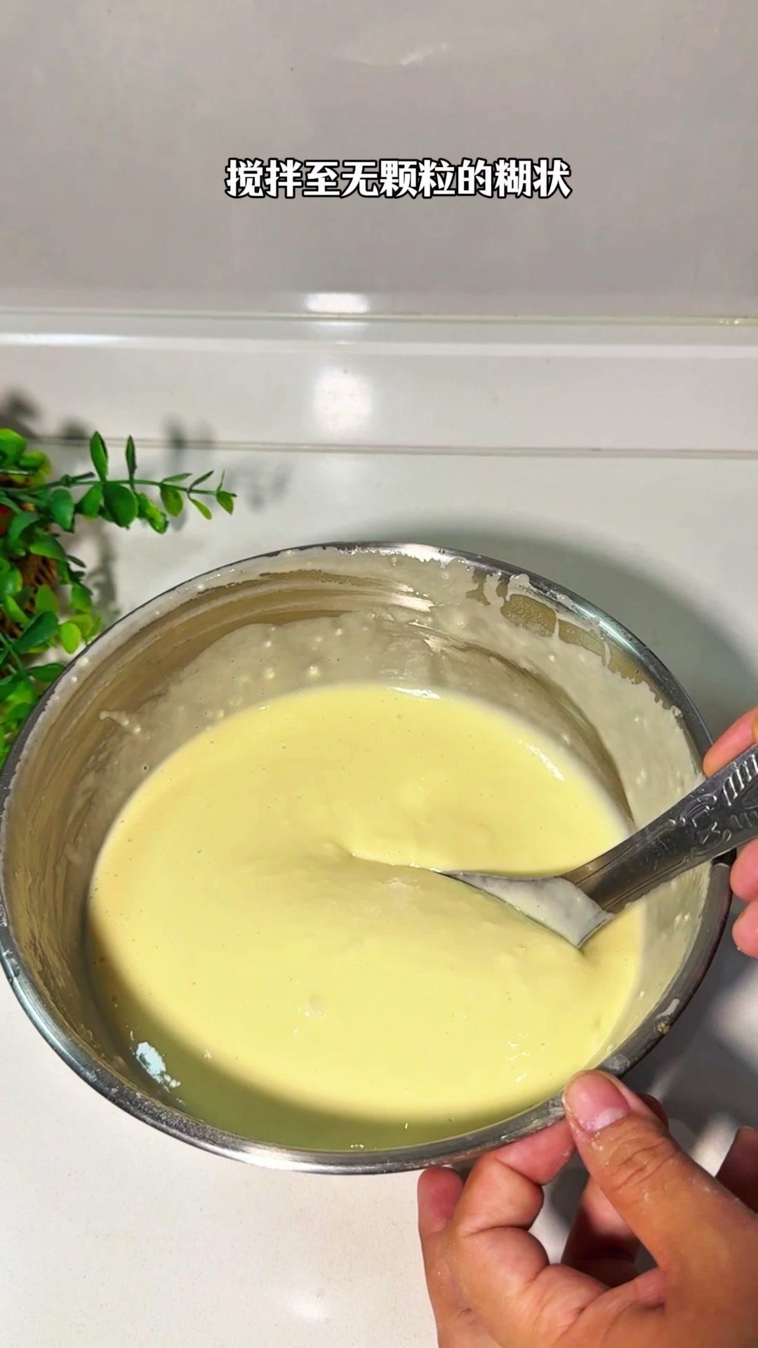 1️⃣准备食材:一碗面粉,三个鸡蛋,适量白糖,一碗半清水。把它们混合搅拌成无颗粒的糊状,这样面糊才够顺滑~