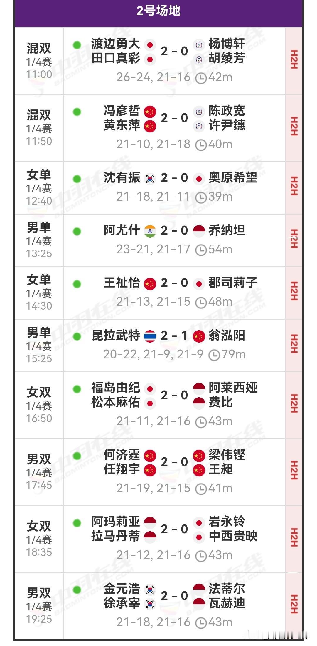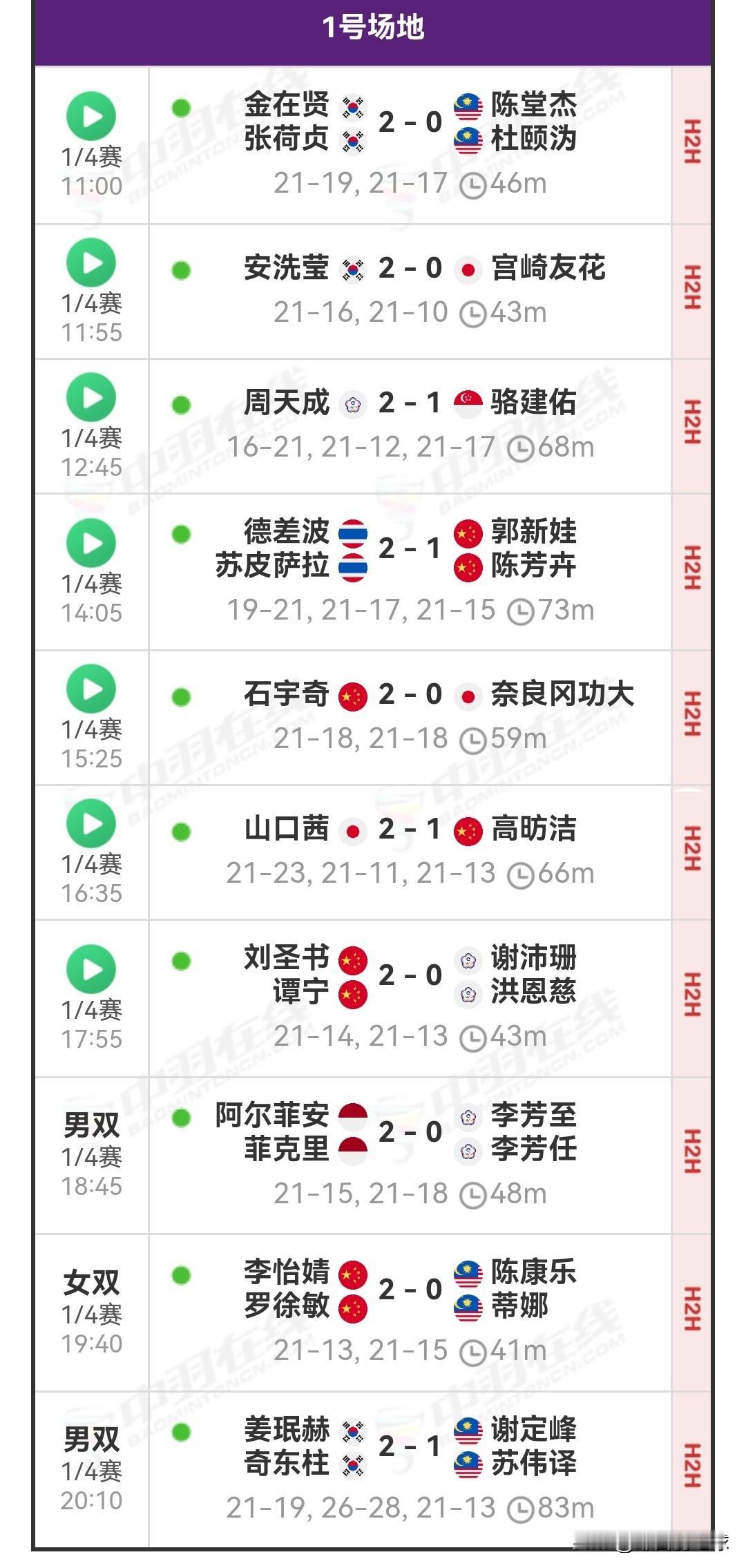明日北京时间10:00起进行半决赛,对阵安排为:石宇奇对阵周天成,王祉怡对阵山口茜,任何组合对战徐金组合,凤凰组合对战德差波/苏皮萨拉。明日详细对阵安排和今日详细战报如图所示。
