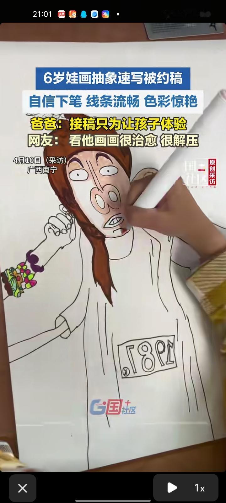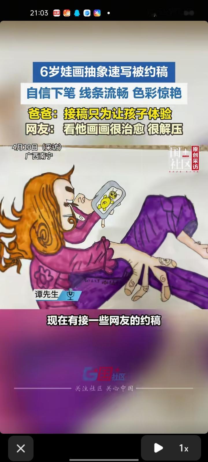 4月10日,广西南宁。六岁娃画抽象速写被约稿,自信下笔,线条流畅且色彩惊艳。