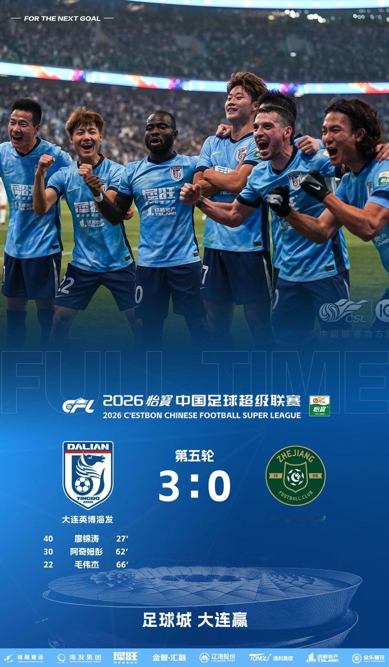 犀旺2026·战报|三连胜!廖锦涛 阿奇姆彭 毛伟杰进球 大连英博海发队3-0战胜浙江俱乐部绿城队
