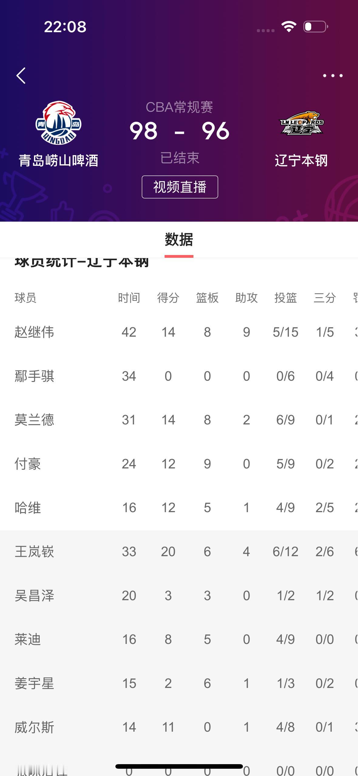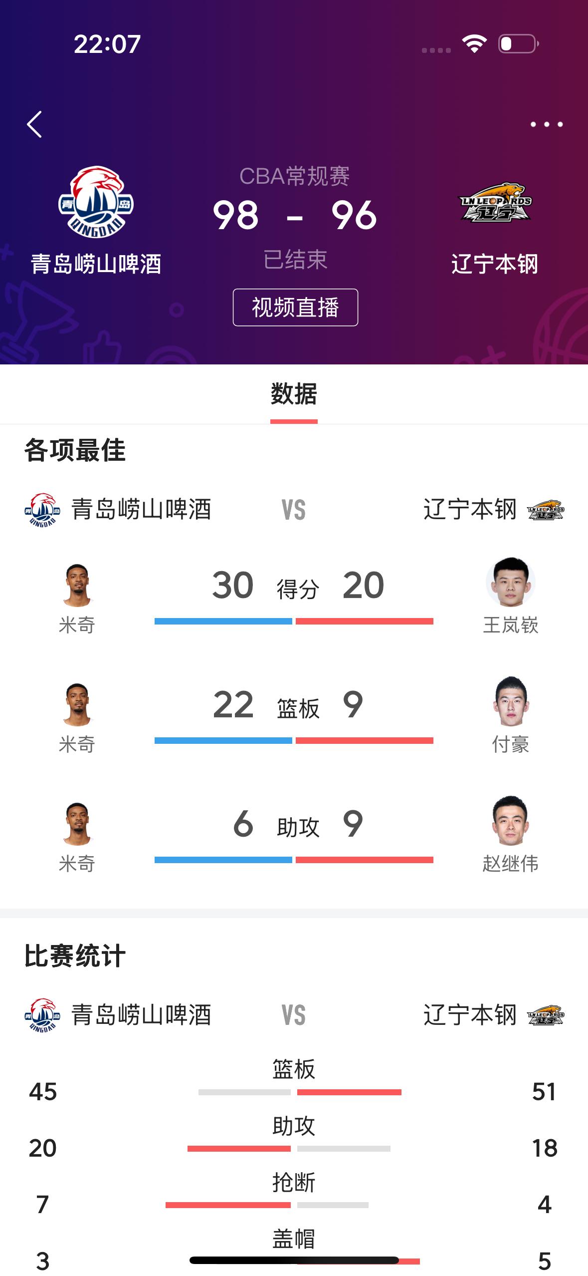 纵观全场比赛,青岛队的外援米奇表现非常出色,拿到了双20,段昂君、王睿泽也是表现出色。反观辽宁本钢男篮,王岚钦表现出色,得分上20,赵继伟、付豪、莫兰德也是得分上双,关键时刻,双加时,莫兰德被罚下,但是莱迪表现出色,但是罚球没有进呀!太可惜了!