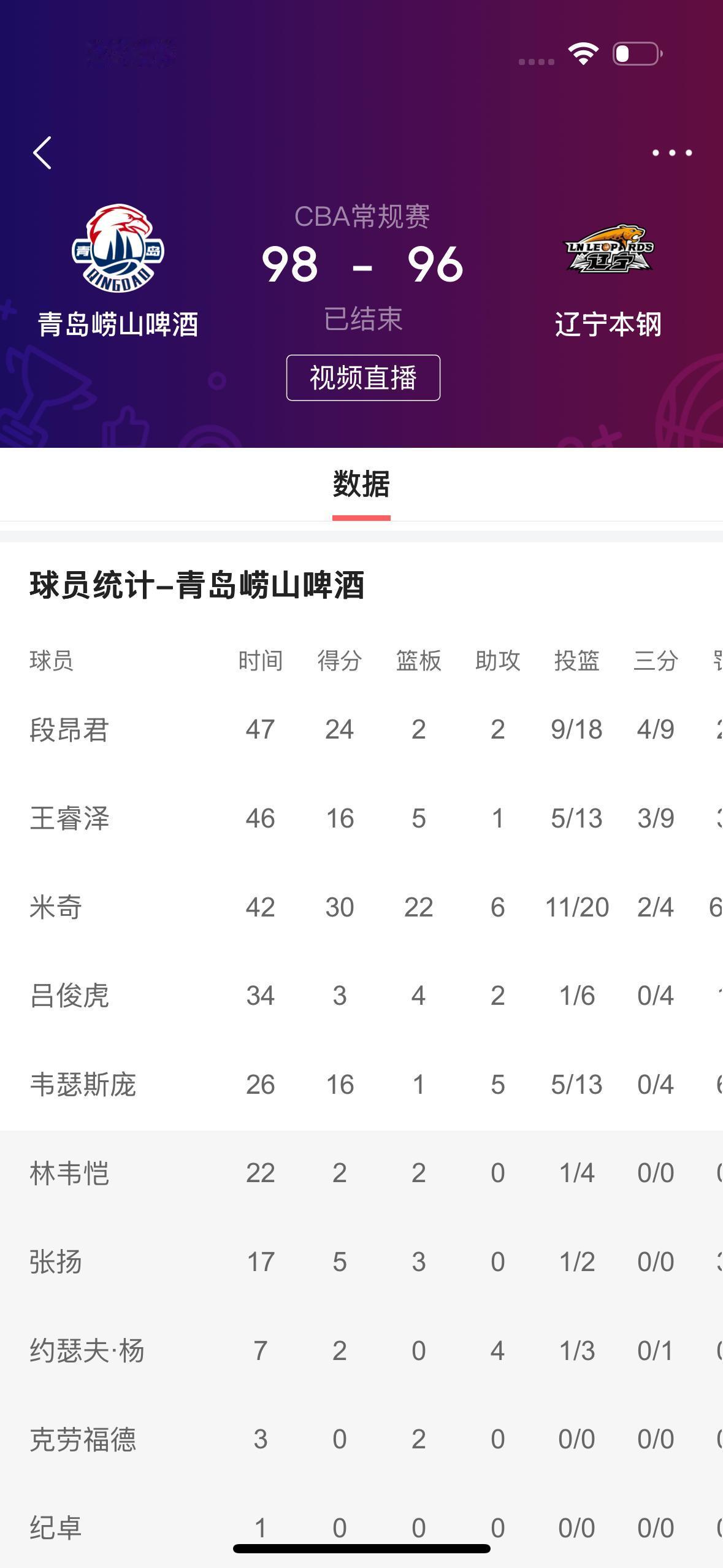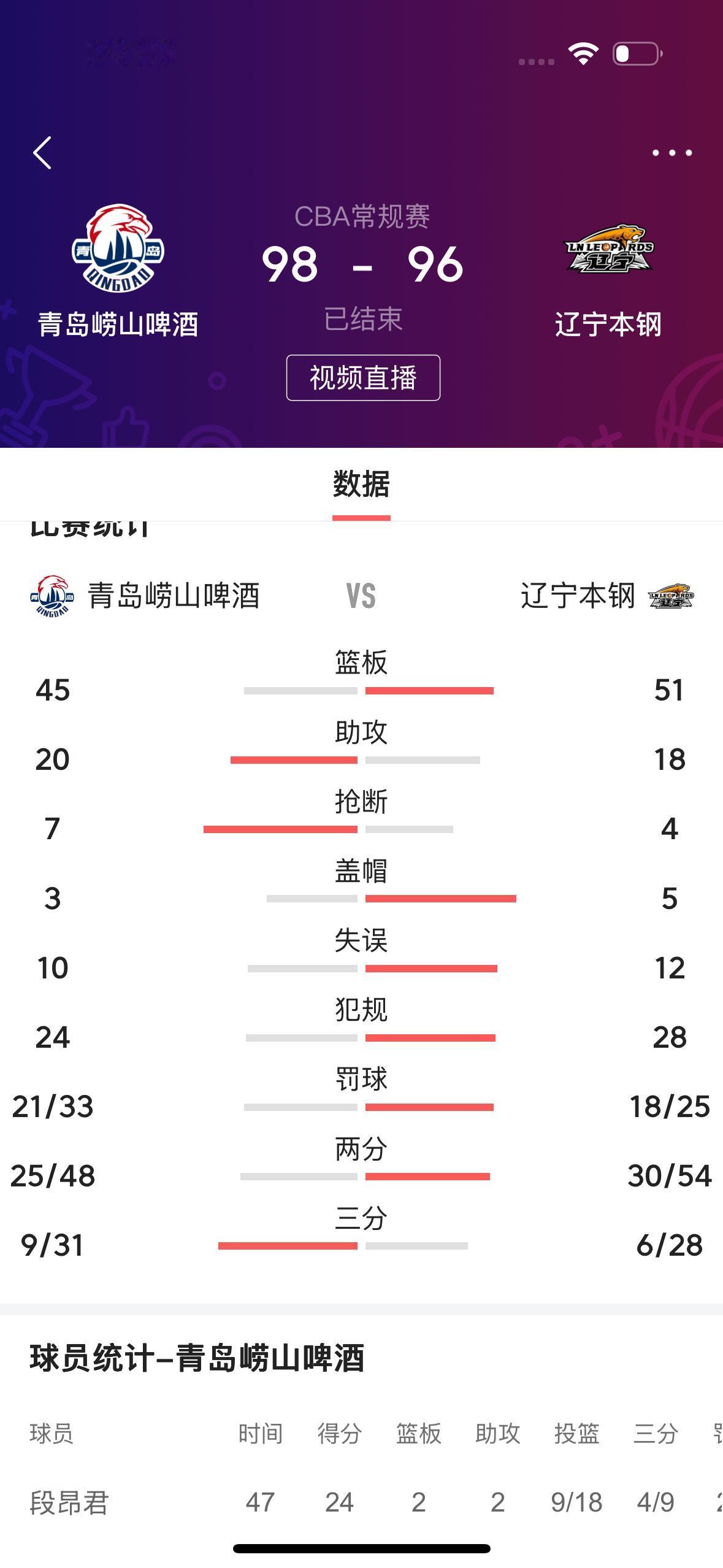 在刚刚结束的青岛崂山啤酒男篮主场迎战辽宁本钢男篮主场的比赛中,最终通过两个加时赛,青岛崂山啤酒以98比96取得了胜利✌️!