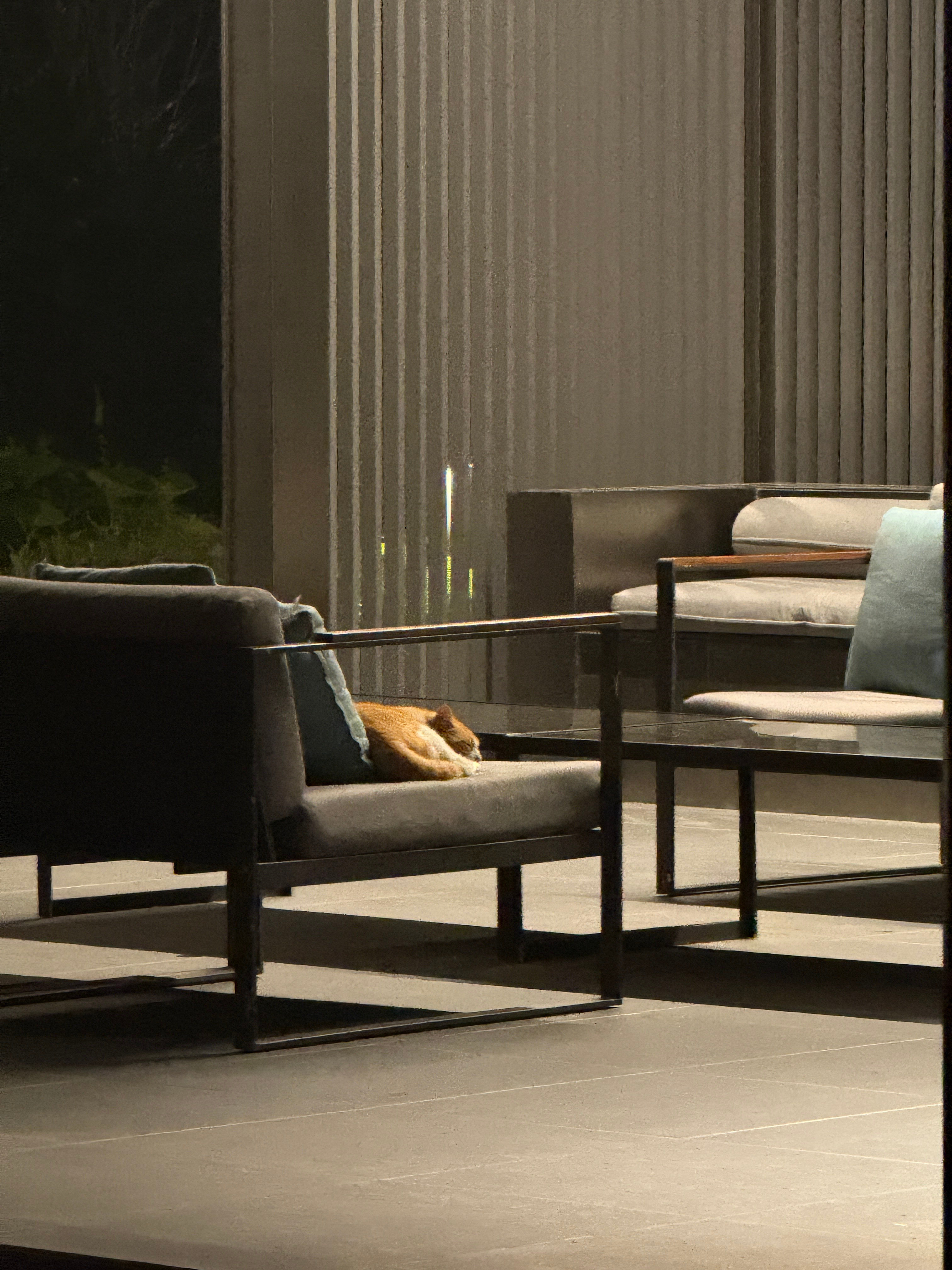 谁懂这一幕!流浪小猫蜷缩在公共的沙发上当自己的小窝在休息,吹着小风, 好温暖安心的感觉