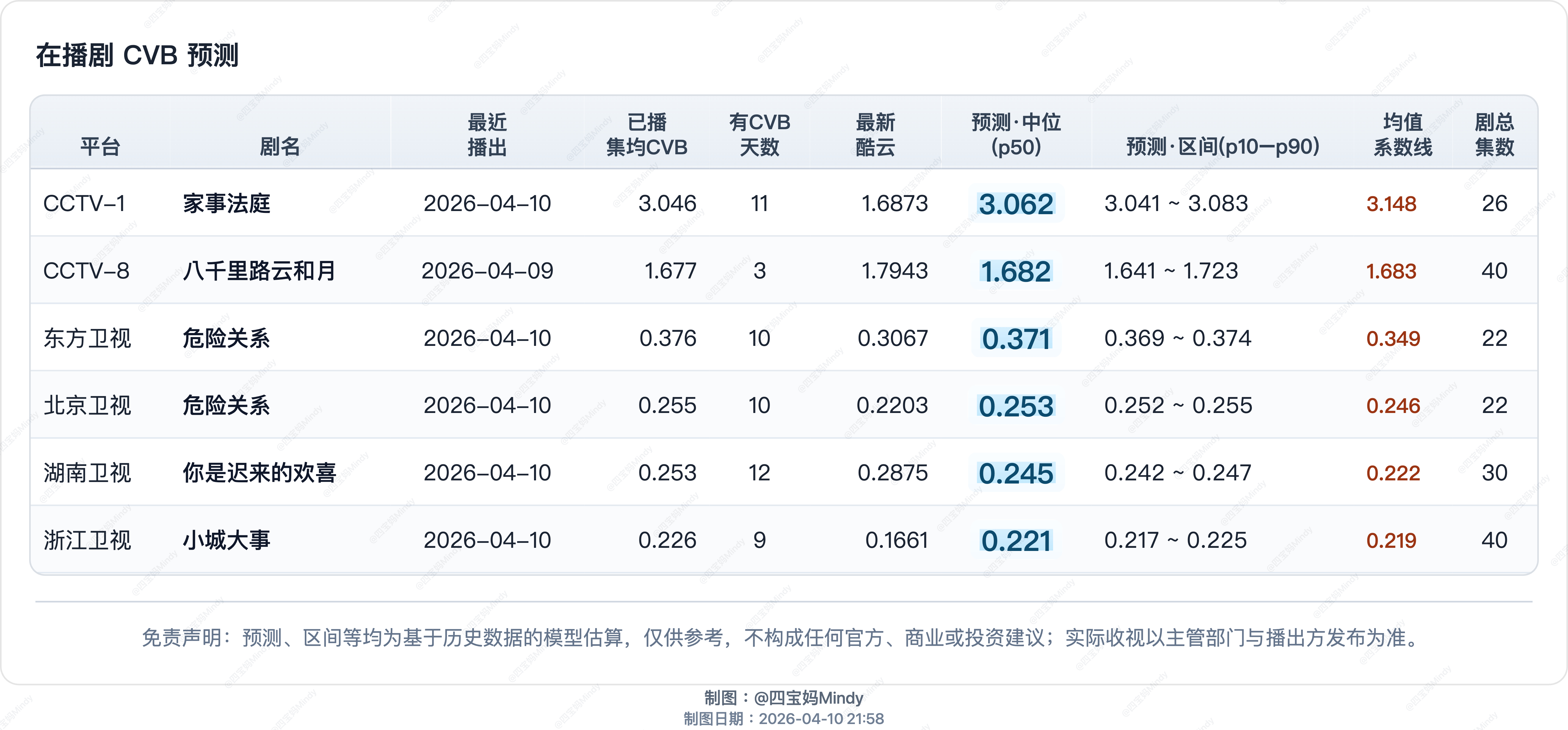 4.10 cvb预测图一是单天,图二是全剧(估计每天都会变动那就每天都发呗,再慢慢修正模型在播剧:家事法庭、八千里路云和月、危险关系、你是迟来的欢喜
