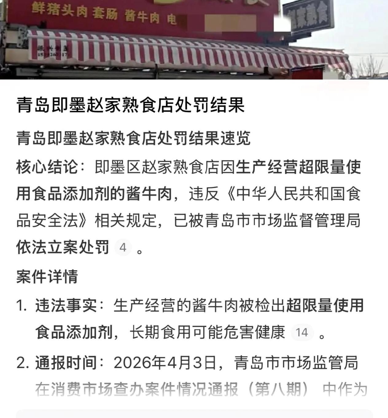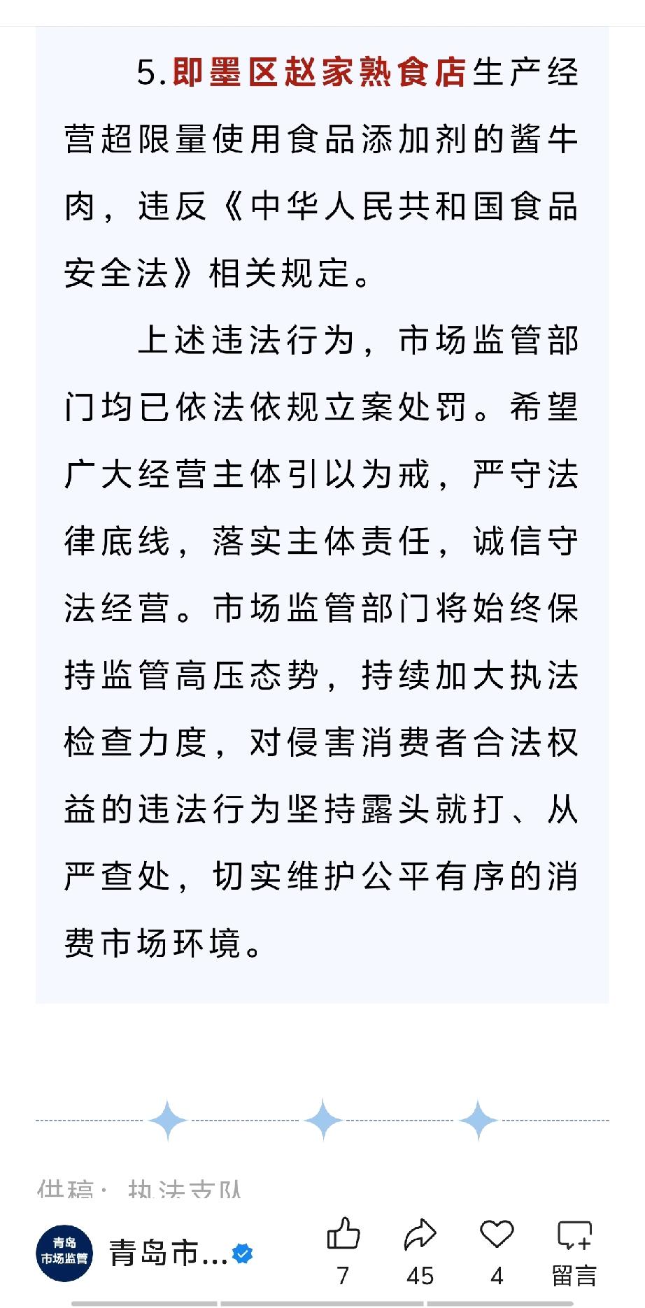 近日,即墨区赵家熟食店的酱牛肉超限量使用食品添加剂被有关部门曝光了,即墨区有好几家赵家熟食店,具体是哪家没有说明!