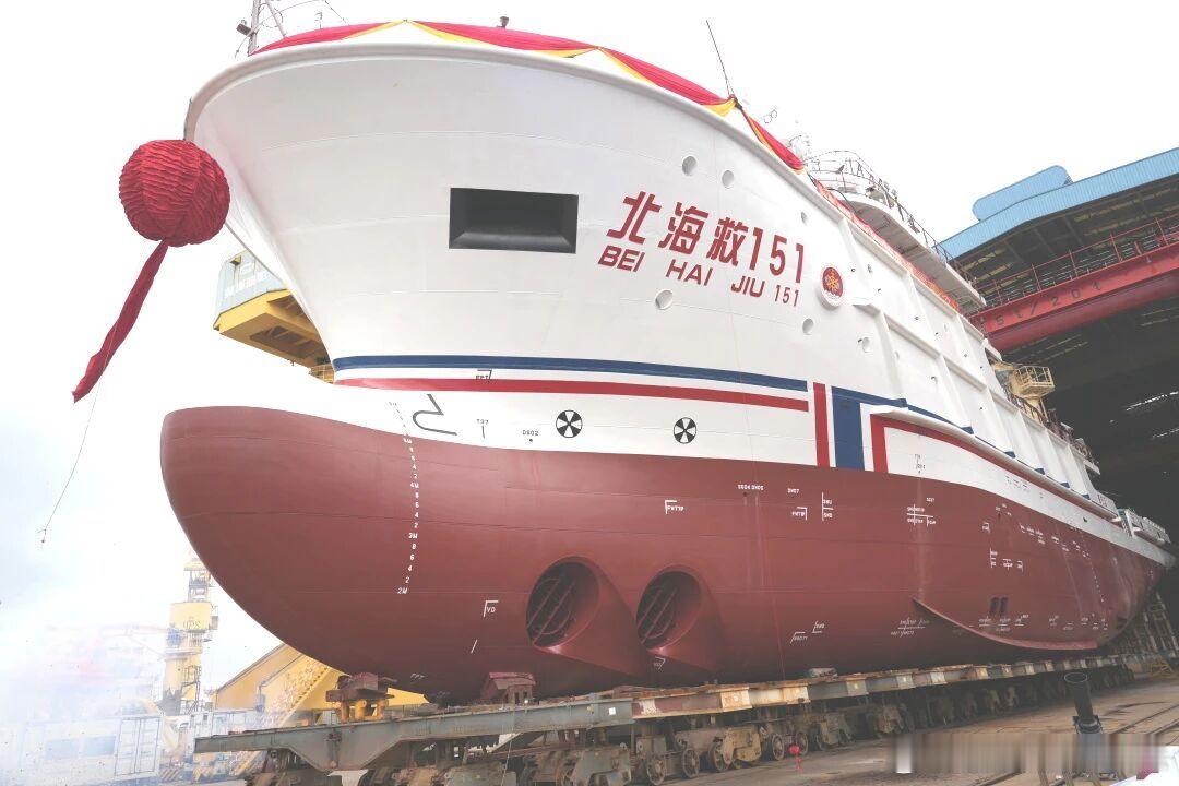 4月9日,由上海船舶研究设计院(SDARI)自主研发设计、黄埔文冲船舶有限公司建造的4000kW中型海洋救助船3号船“北海救151”轮下水。作为上船院精心打造的升级之作,该船是以首制船“东海救151”轮为基础,结合海上救助新需求、新场景开发设计的冰区加强型中型救助船,主要用于沿海水道、岛礁等浅水区域的人命救生与船舶救助,也可兼顾高海况下的救助任务。该船全长69.5,舷宽14.6米,除具备消油、灭火等常规救助的能力外,还具备三点锚泊能力,并配备一艘新型无人救助艇,可开展潜水训练支持和预设航线搜救等任务。该船采用全电力推进系统,配备全回转式推进器及DP-2动力定位系统,操纵性能优异,能够适应各种复杂海况的救助作业需求。该船具备拖带救助、对外消防、雾天夜间搜救、水下救援等多种作业能力,且为满足冬季北方海域救助需求,具备B2级冰区加强,可在中等冰况下实施海上救援