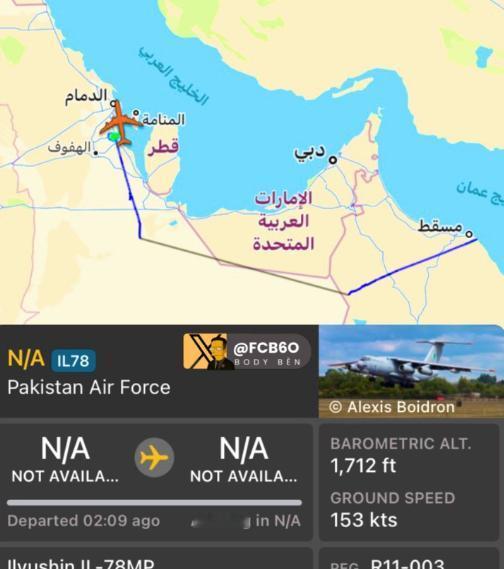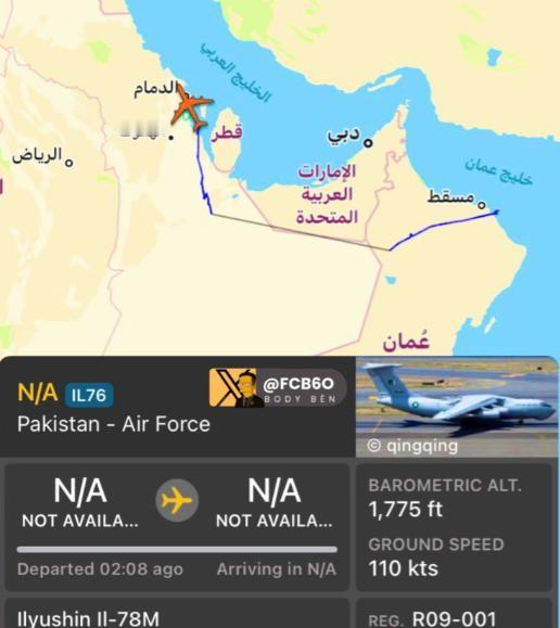 这可不是什么例行演习,也不是常规巡逻,而是实打实的“硬核护驾”行动。根据全球飞行跟踪数据和开源情报证实,巴基斯坦空军这次是动了真格的——2架伊尔-78MP空中加油机率先出现在巴林东侧海湾上空,全程无呼号秘密盘旋,目的就是为前线战机提供空中加油支援,保障续航能力。紧接着,1架萨博/ZDK-03预警机也加入编队,在波斯湾空域构建起空中指挥网络,实时监控周边空域动态,防止以色列战机突然偷袭。