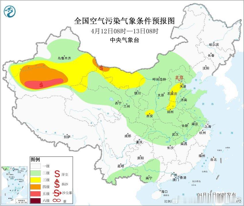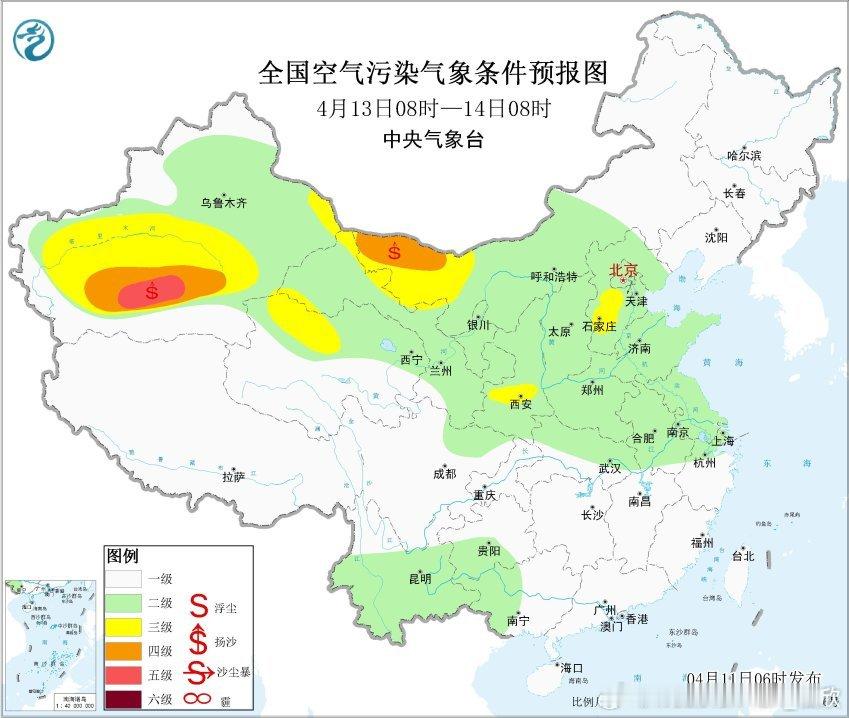 【沙尘】11日至13日,新疆南部、内蒙古西部等地的部分地区有沙尘天气,其中,11日至12日,新疆南部、内蒙古西部局地有沙尘暴。