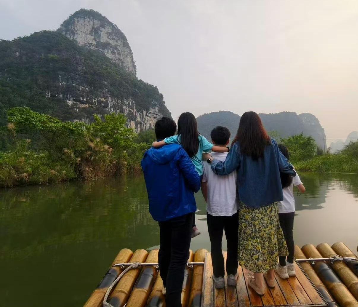 郭晶晶霍启刚带三个孩子游广西,夫妻俩低调松弛,孩子们有少年气,一家五口站在青山绿