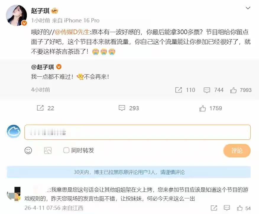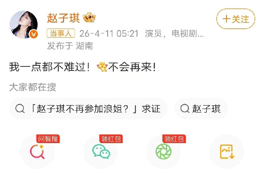 赵子琪成为《浪姐7》第一个被淘汰的姐姐,她破防了,发文直言:我一点都不难过,不会再来。