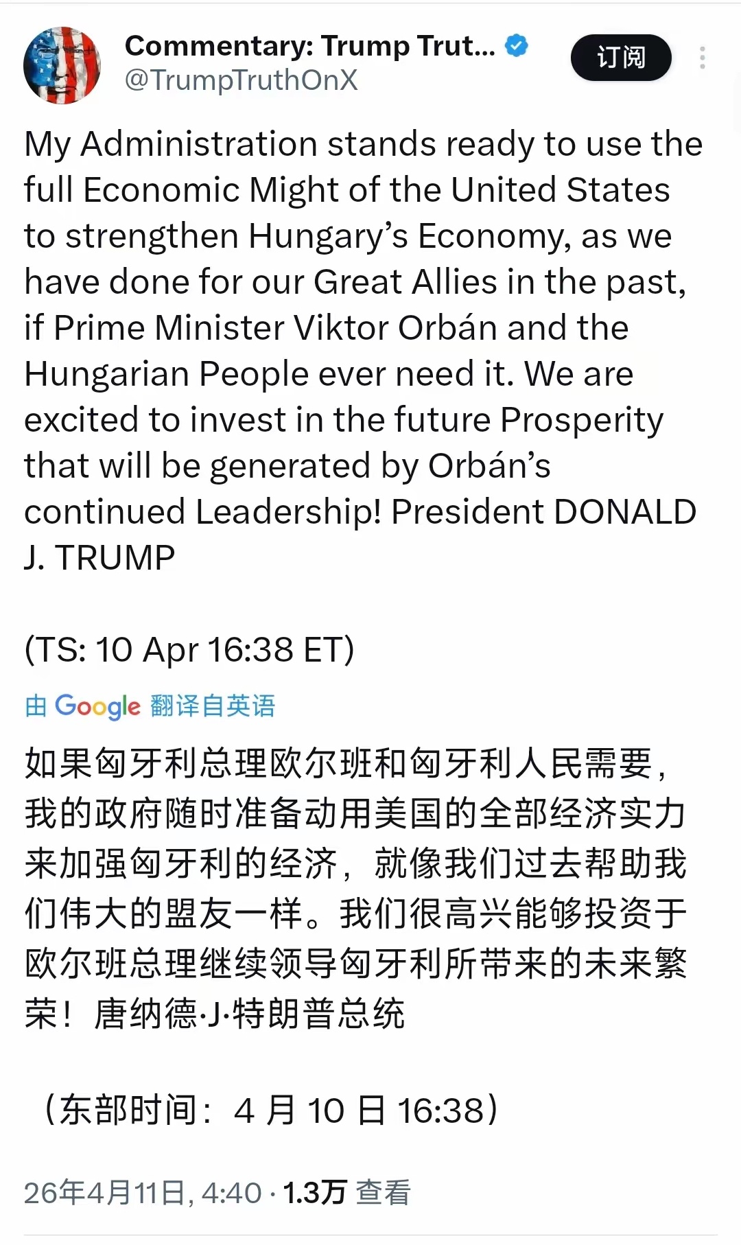 特朗普:“如果匈牙利总理欧尔班和匈牙利人民需要,我的政府随时准备动用美国的全部经济实力来加强匈牙利的经济,就像我们过去帮助我们伟大的盟友一样。我们很高兴能够投资于欧尔班总理继续领导匈牙利所带来的未来繁荣!”