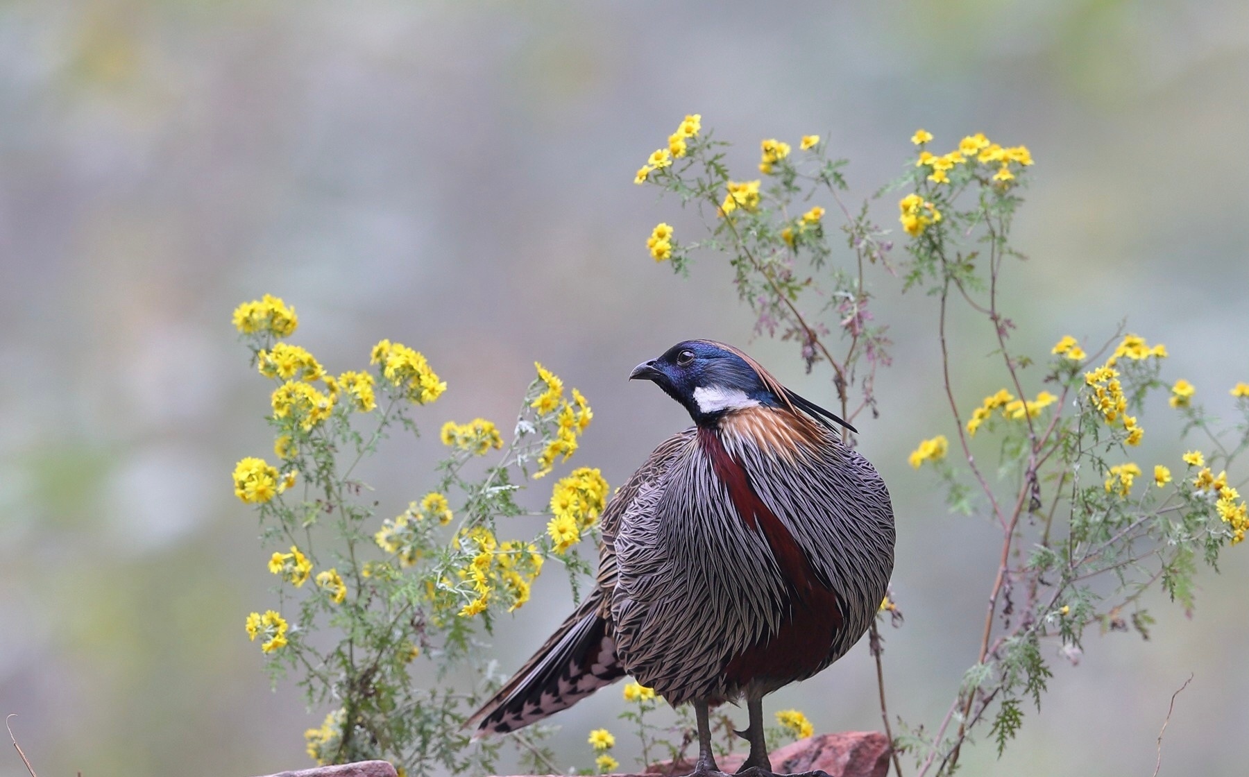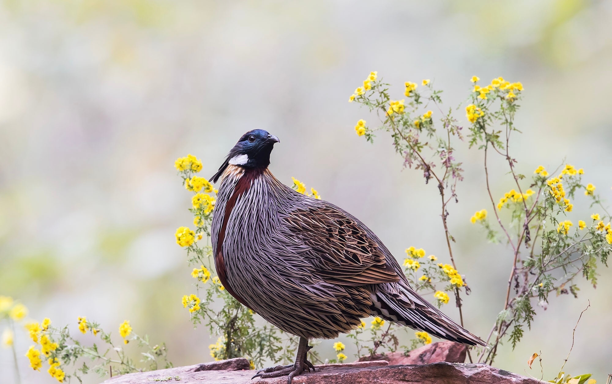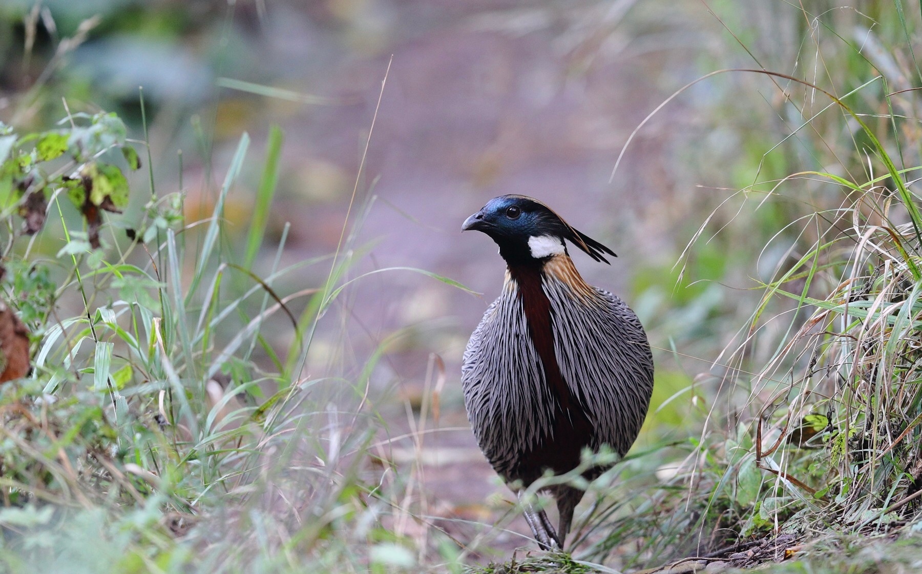这小家伙是勺鸡,雄鸟长着标志性的蓝黑色脑袋,颈间还有一圈白,身上的羽毛像穿了件带纹路的复古外套,特别精致。
