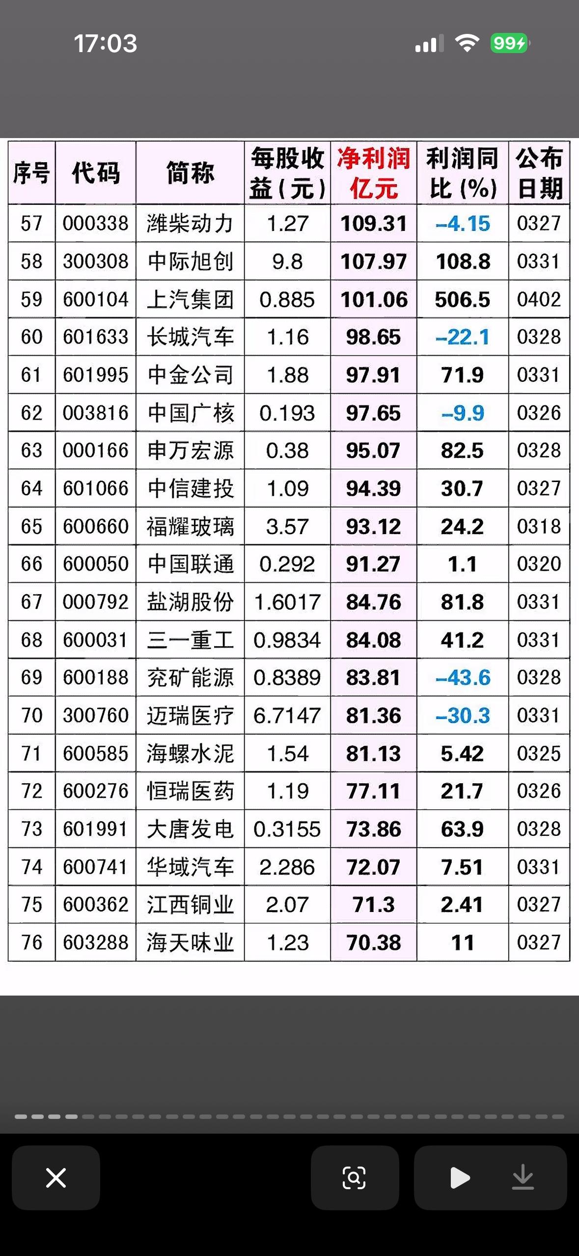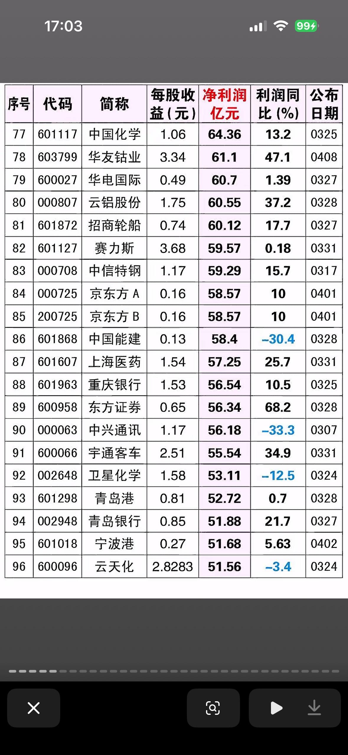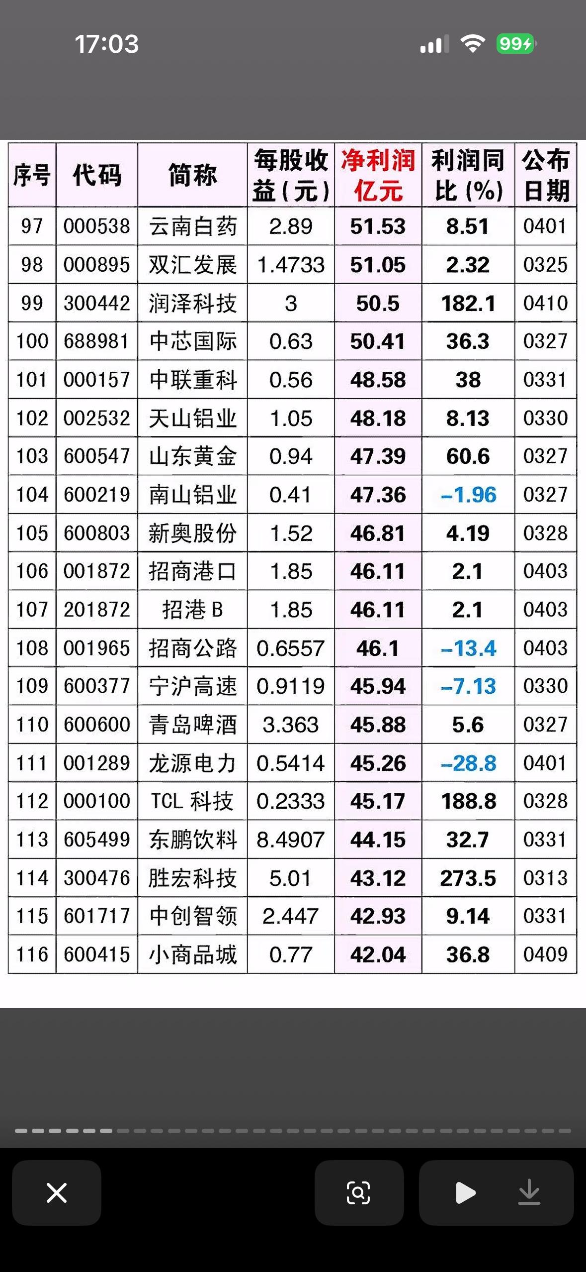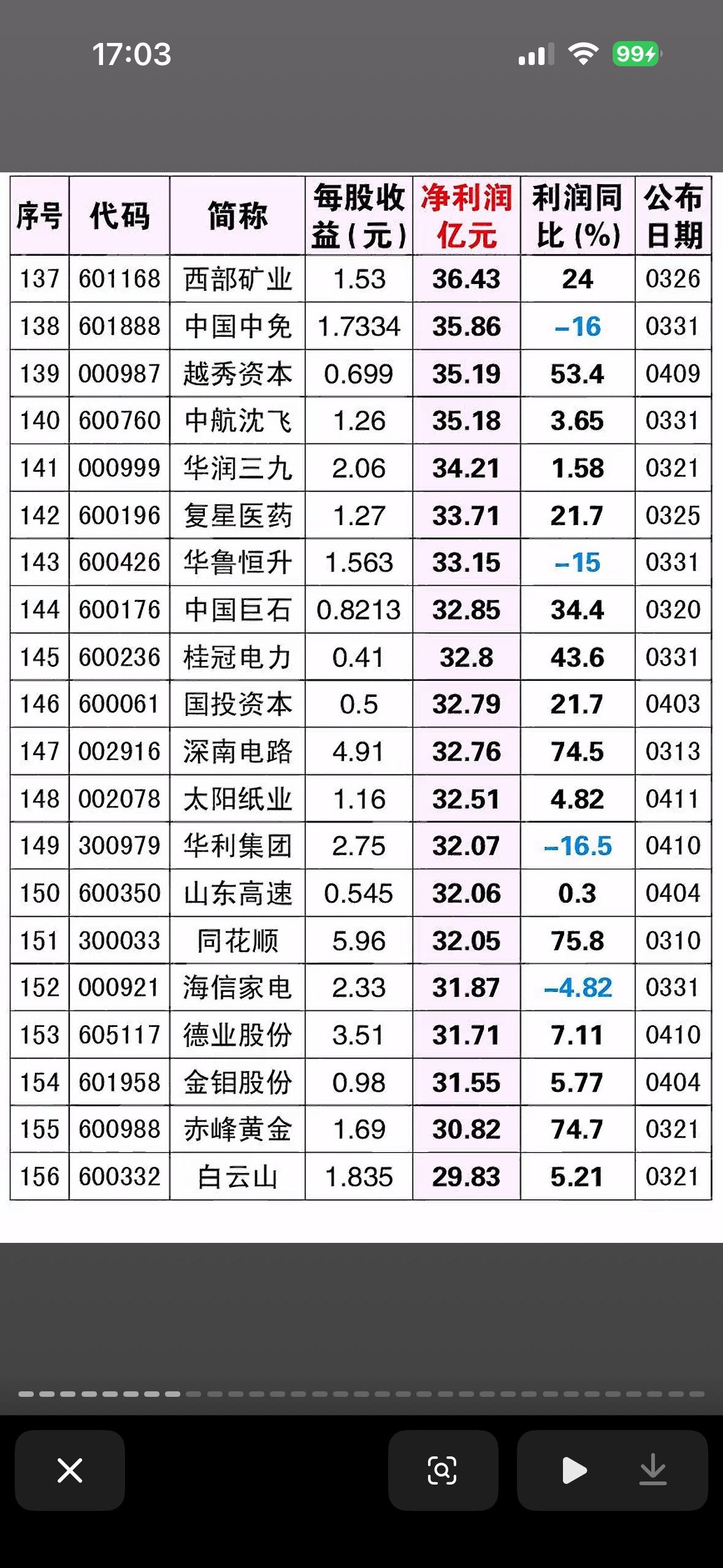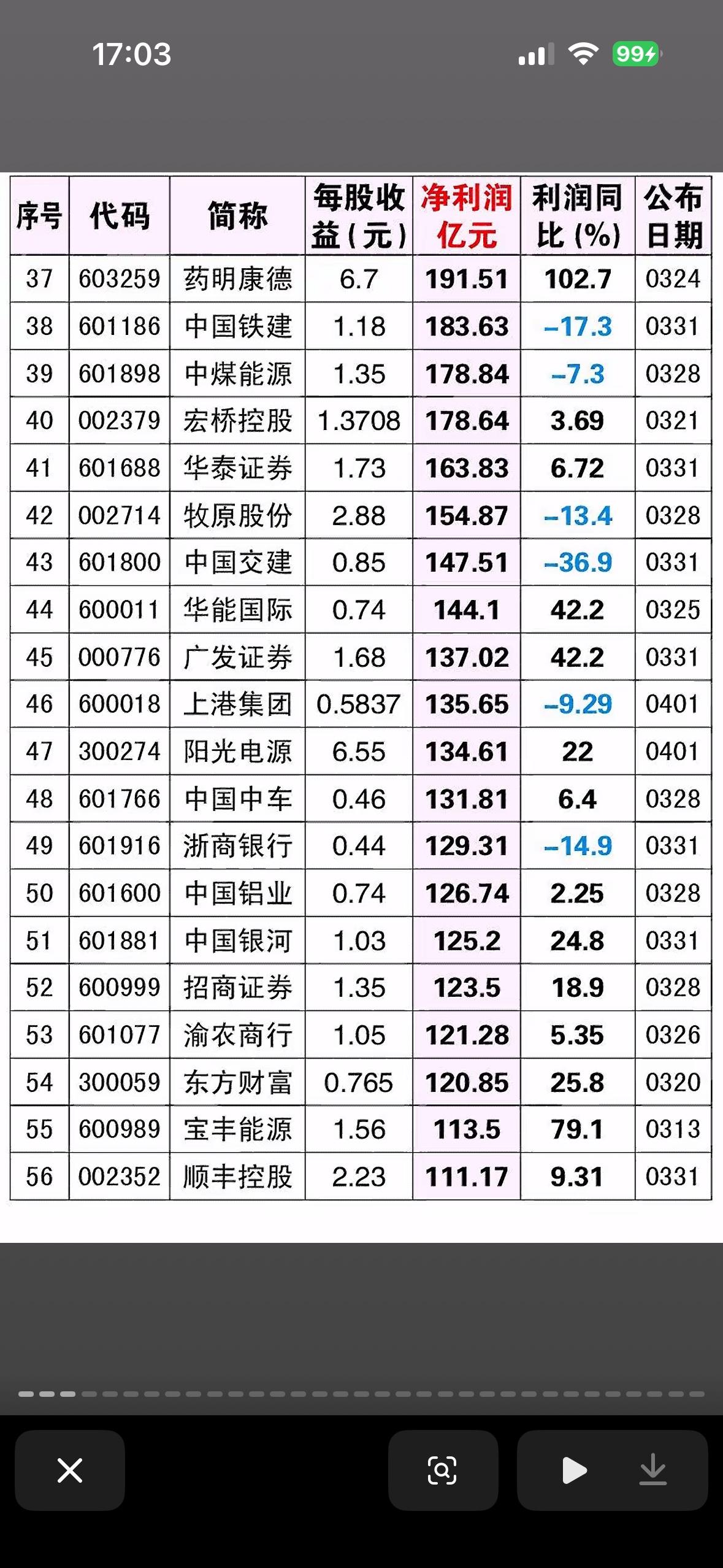 - 四大行(工、建、农、中): 合计净利润超过1.2万亿元,是A股市场的定海神针。