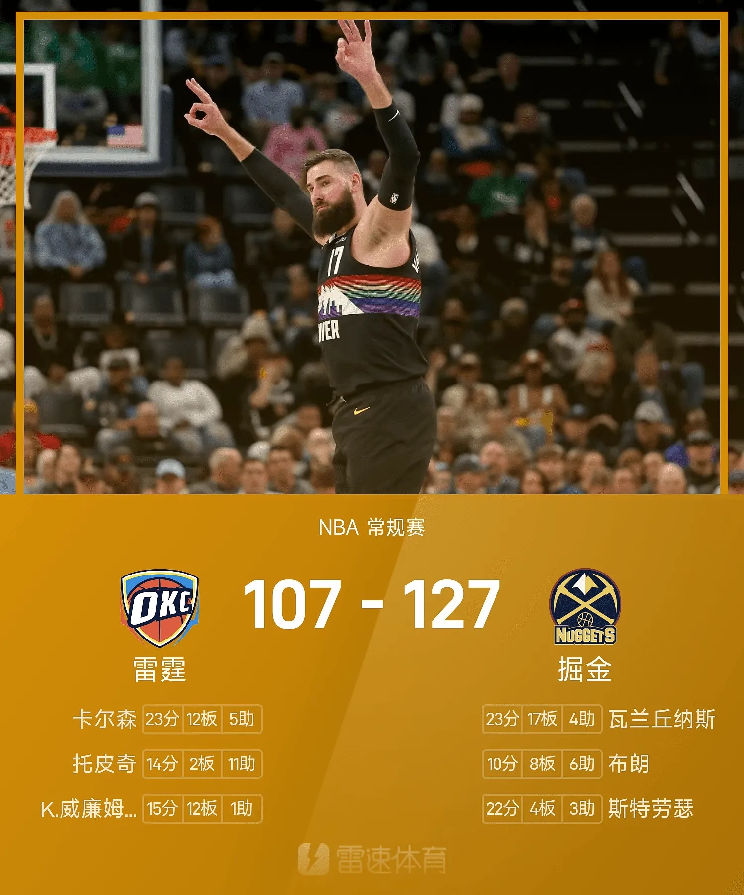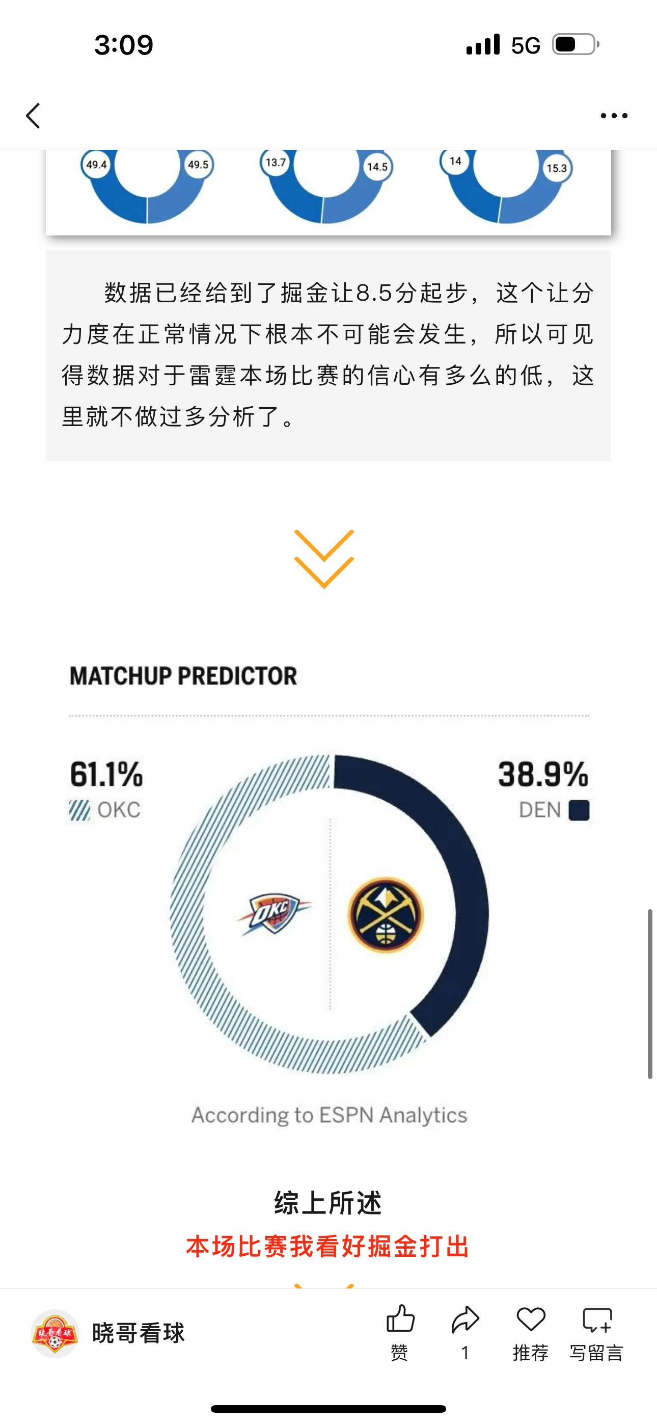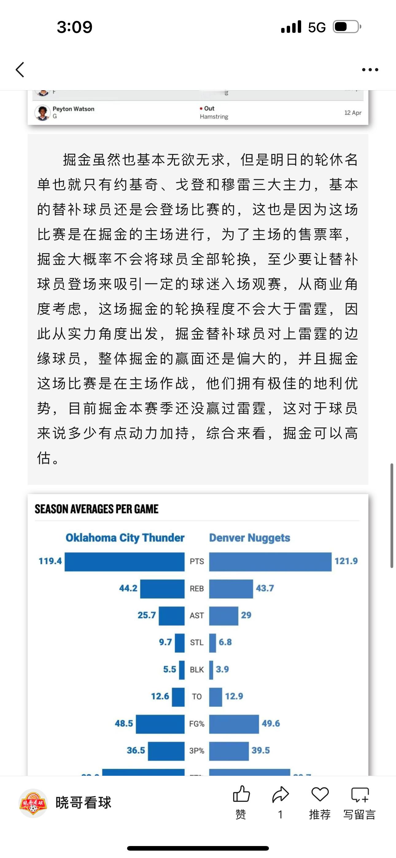 昨日公推掘金收获好评,这场比赛雷霆战略性放弃,和赛前的分析一致,雷霆派出的都是一些边缘性的人物,反观掘金虽然也对主力进行了轮休,但是他们的替补核心基本都出战,其中瓦兰丘纳斯砍下23分17板,面对雷霆的角色球员几乎没有遇到太多阻力,本场好评合理!体彩nba雷霆vs掘金篮球预测