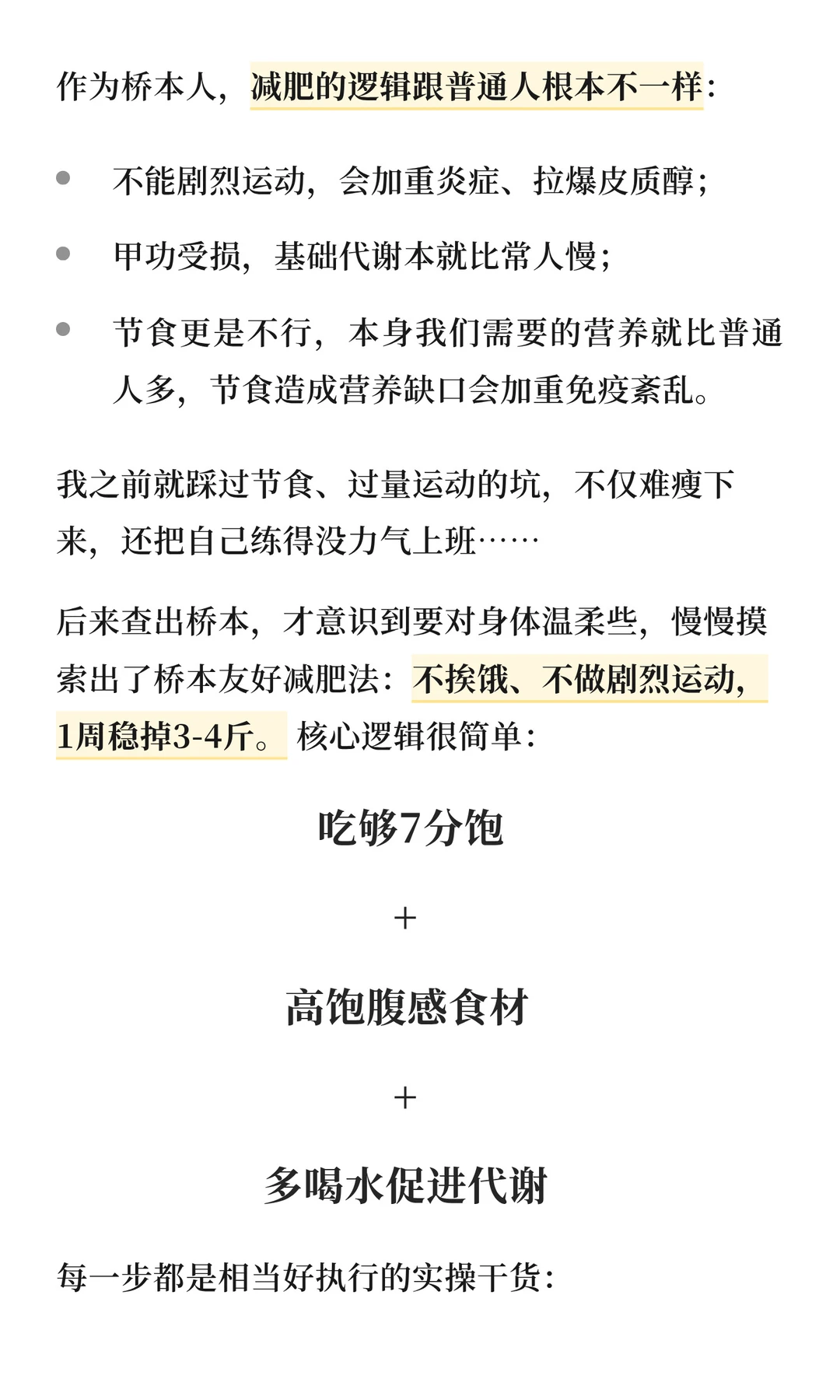 虽说桥本人减肥不能靠节食和剧烈运动,但是本人亲测,只要找对方法,桥本人掉秤其实比普通人要更轻松一些。