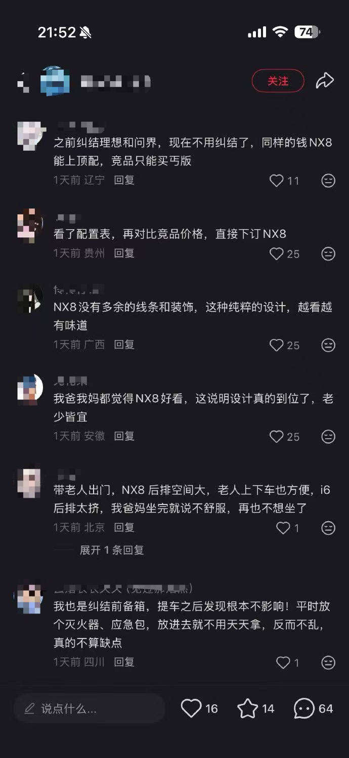 此外,近日有车圈博主曝光,全网出现大量模板化水军通稿,标题统一为《试驾NX8和i6后,我彻底无语了…》,内容一边吹捧NX8、恶意拉踩理想i6,话术雷同,疑似有组织恶意营销。