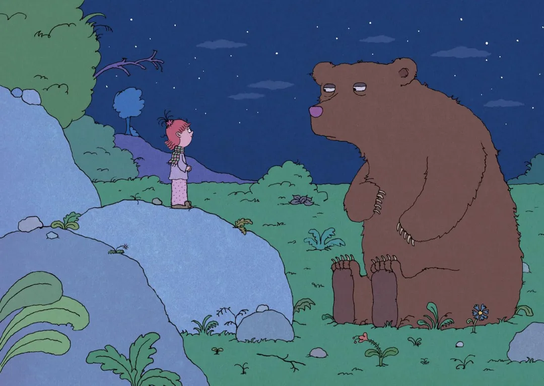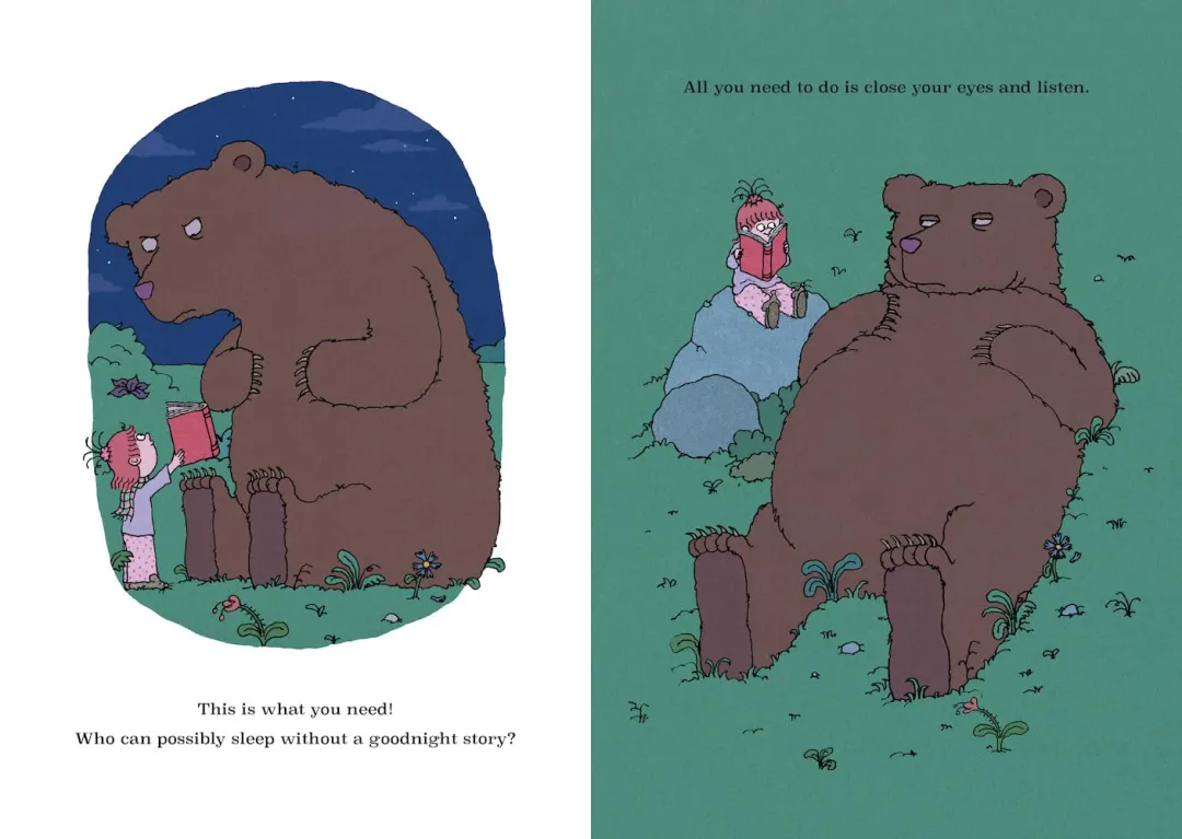 森林里的所有动物——甚至连月亮——都已经睡着了。只有一只和她一样睡不着的困倦小熊。于是,露西亚决定给它讲个睡前故事。跑回屋里拿了一本书,给小熊读起了睡前故事,转眼间,小熊就呼呼大睡起来。这时小女孩才恍然大悟——原来,她忘了让爸爸给自己读睡前故事,那可是她每次都能睡着的法宝!