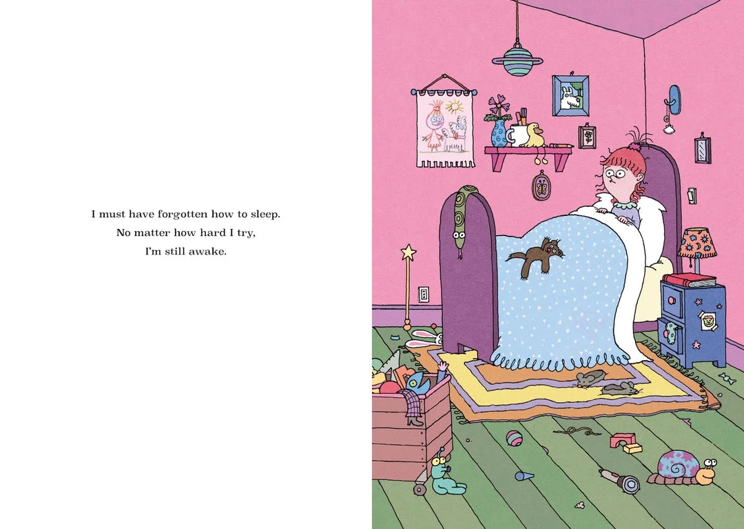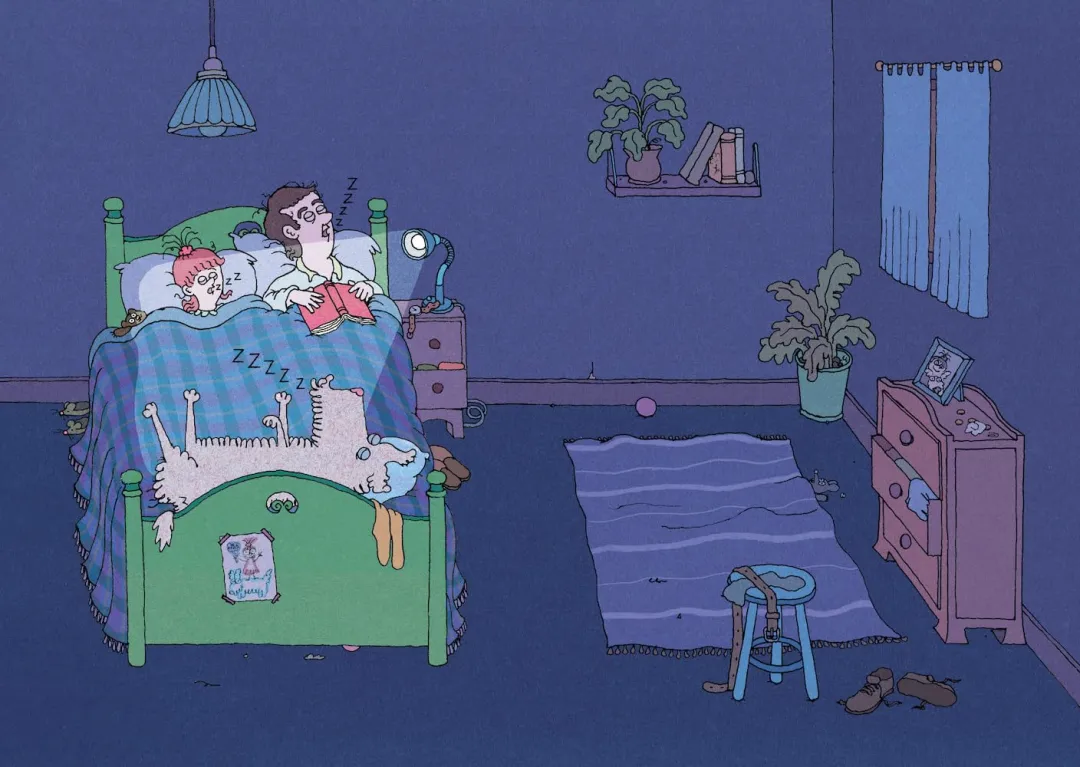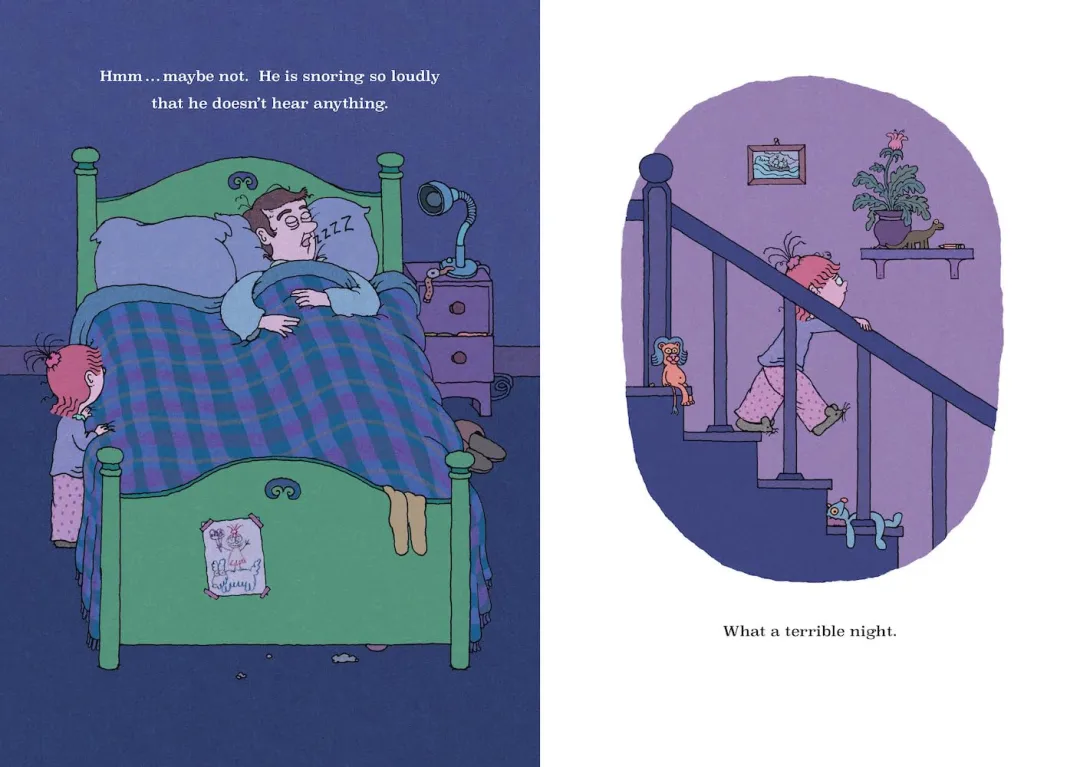 她想问问爸爸,可是——爸爸已经睡着了。她试着模仿狗狗打呼,依然睡不着。