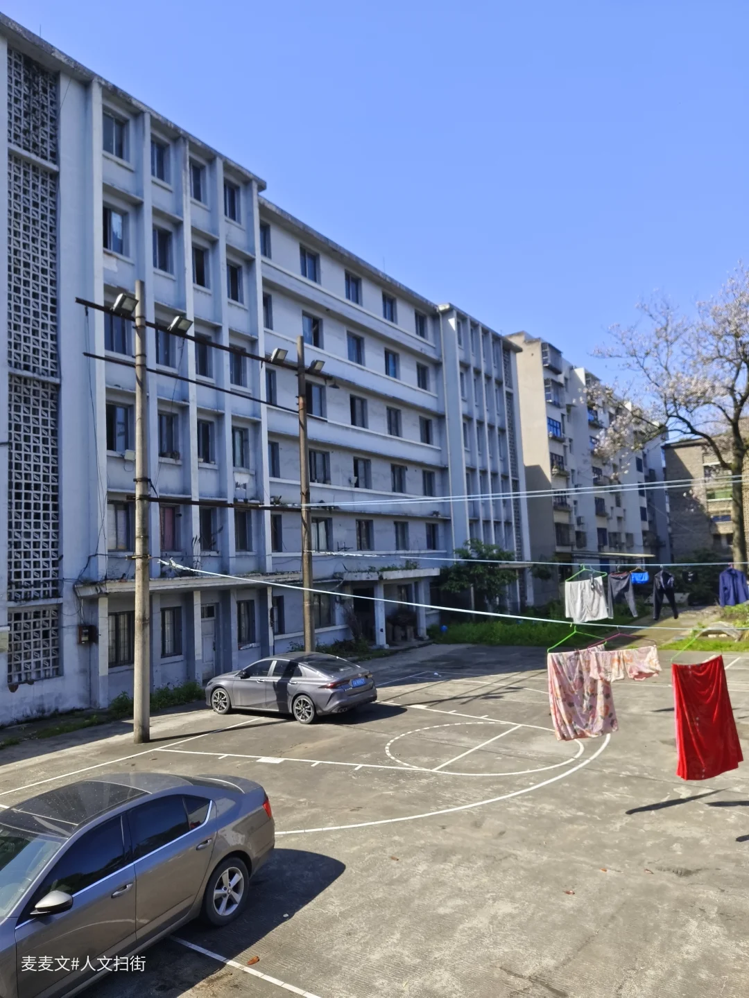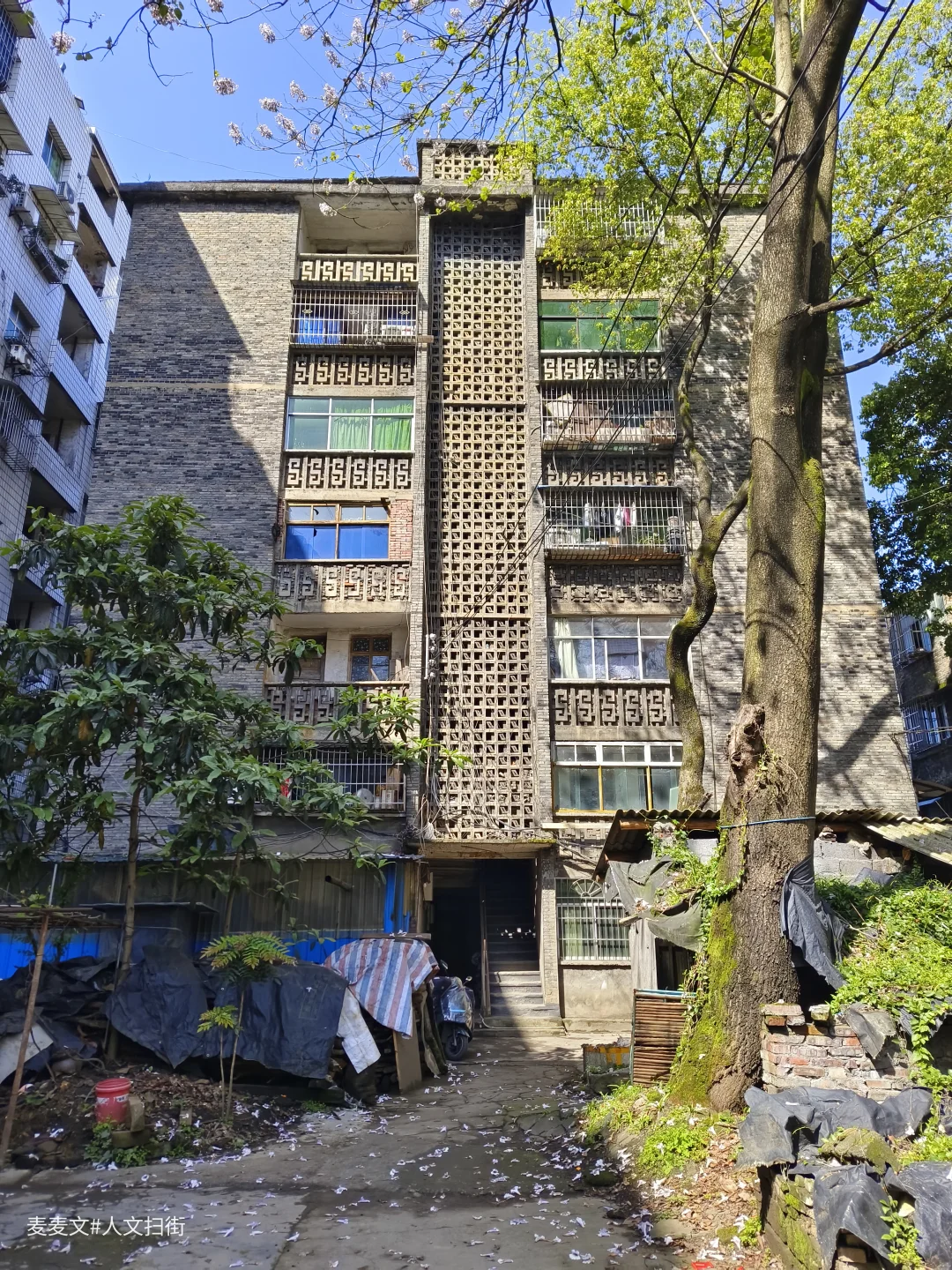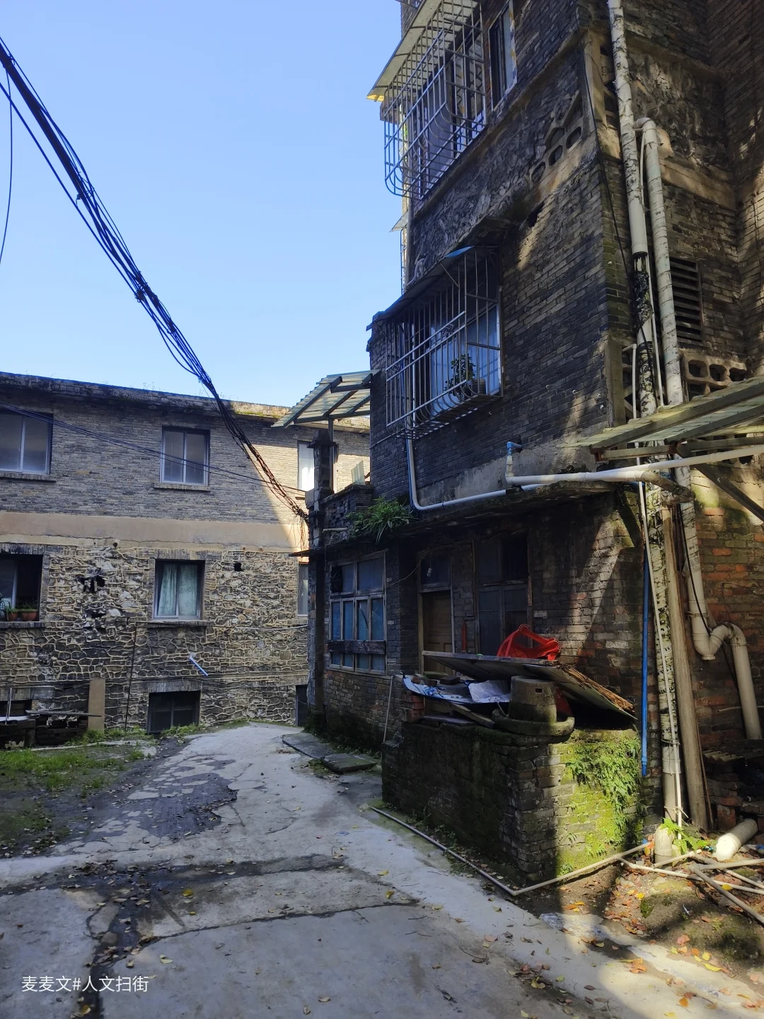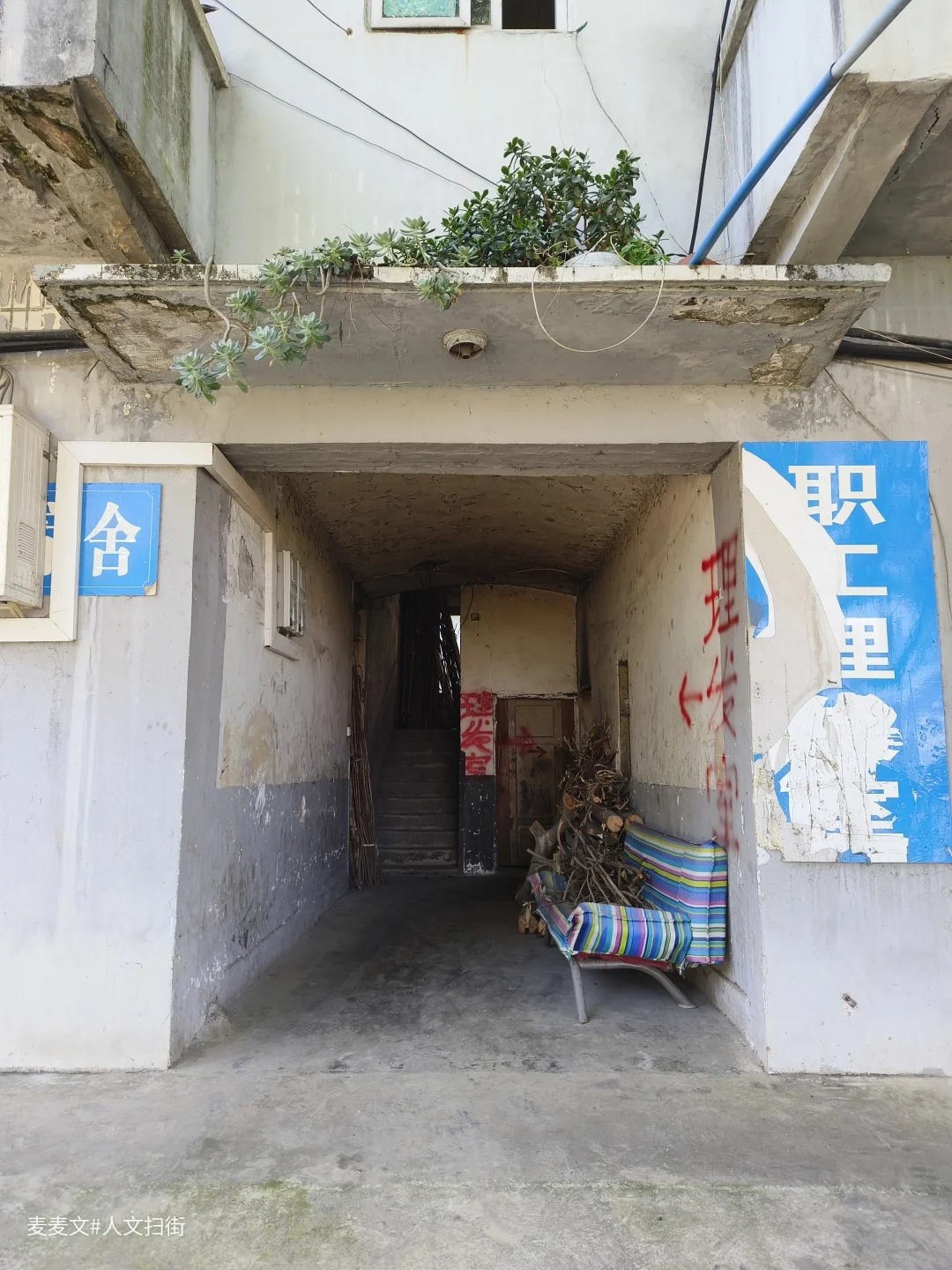 平安大道的路牌还立在巷口,两旁是爬满青苔的苏式老楼,镂空花砖、石砌墙身,每一处都刻着80年代的印记。曾经的职工宿舍里,阳台还堆着老矿工的盆栽,晾衣绳上飘着日常的衣物,篮球场成了临时停车场,理发室的红漆箭头在楼道里斑驳,却还留着当年的生活脉络。