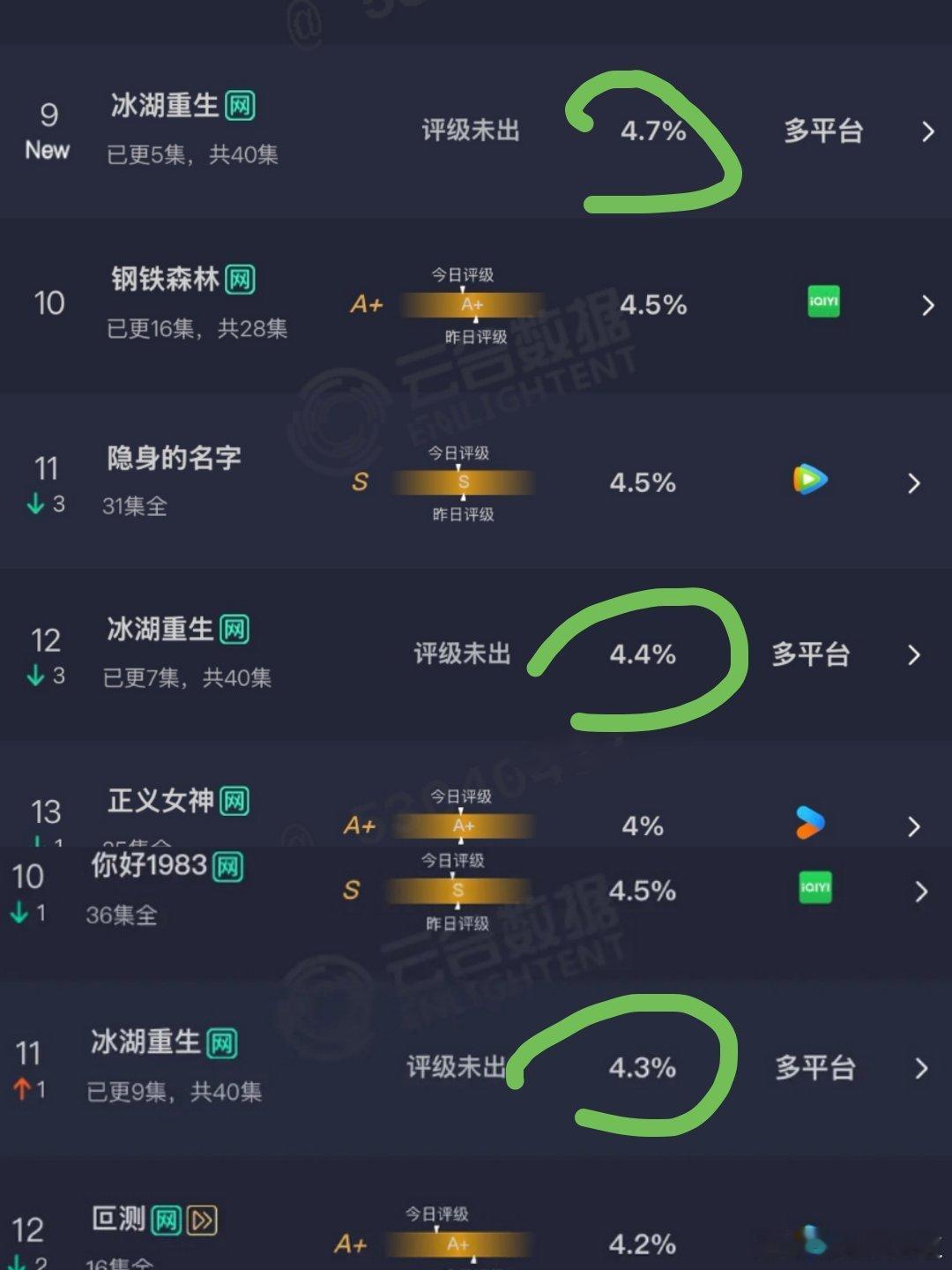 《江湖夜雨十年灯》好歹前三天云合是越播越高,《冰湖重生》前三天云合是越播越低,侣