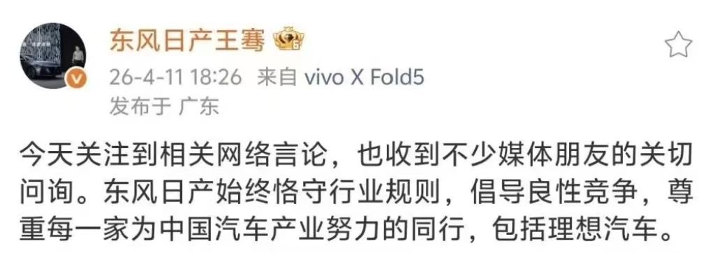 他表示,东风日产始终恪守行业规则,倡导良性竞争,尊重每一家为中国汽车努力的同行,包括理想汽车。
