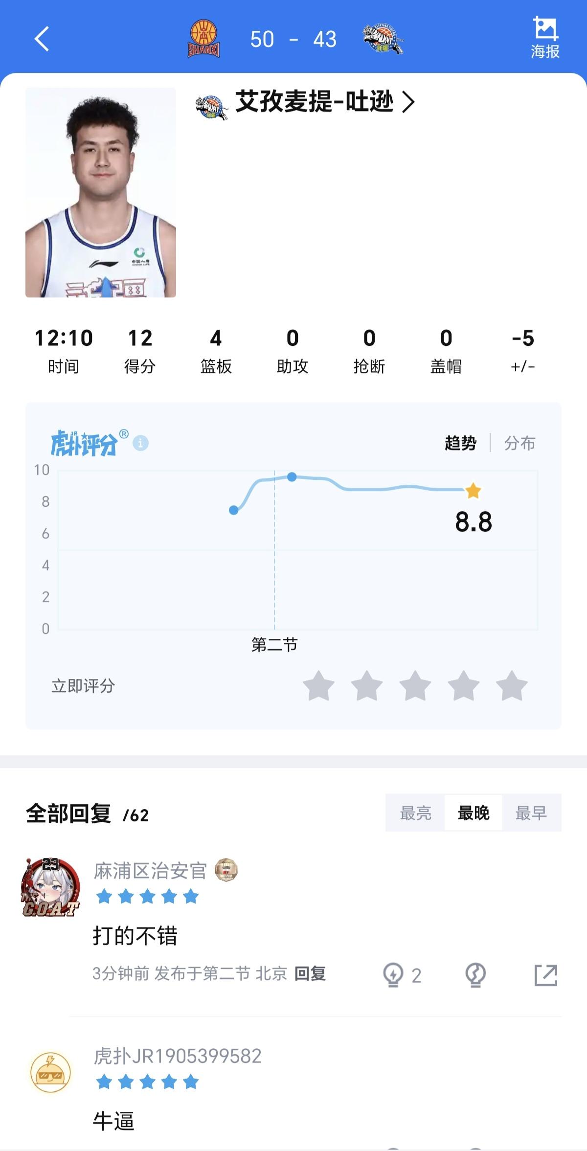 整个上半场,他出场12分钟,砍下12分4篮板,是新疆男篮得分最多的球员。他虽然体重比曲笑宇大,但速度并不比曲笑宇慢呀!得分效率比曲笑宇高,拼抢篮板球又很凶狠。如果恢复他以前的外线远投的话,说不定真能弥补阿不都伤缺的损失呀!新疆男篮