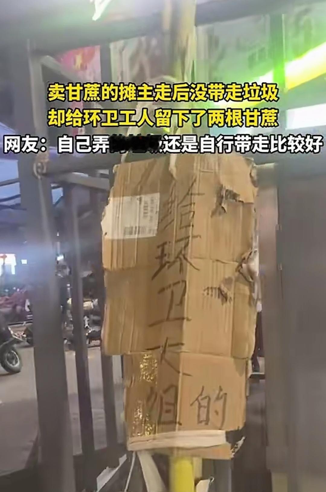 只因摊主未清理蔗皮,留了两根甘蔗,还用纸壳写明“留给环卫大姐的”,视频一经发布,
