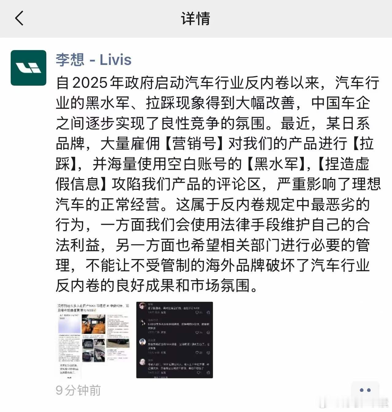 如今理想i6的畅销,外加接下来要发布的L9 livis等车型,少不了贴身肉搏的竞争,但遇到下三滥手段搞不正当竞争,理想现在的态度是坚决明确的,正所谓打得一拳开免得百拳来!李想朋友圈再发文