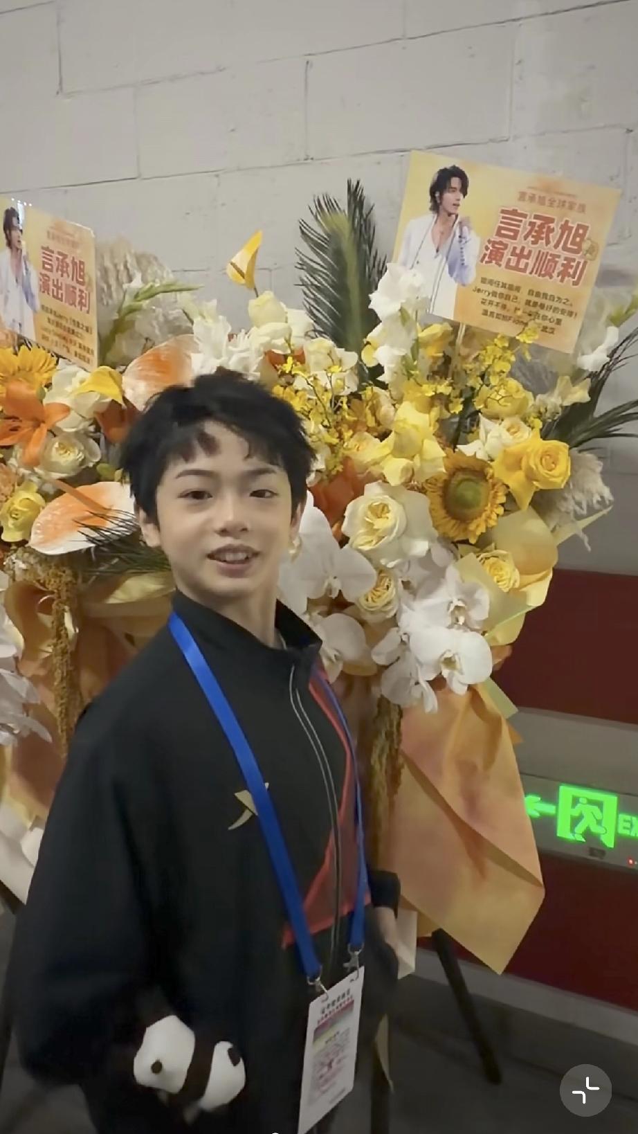到了后台,秋秋晒出在演唱会现场花篮前面的合影,他看着好自信,这次参加了恒星之城的重庆演唱会之后,他估计要火了,非常有前途。