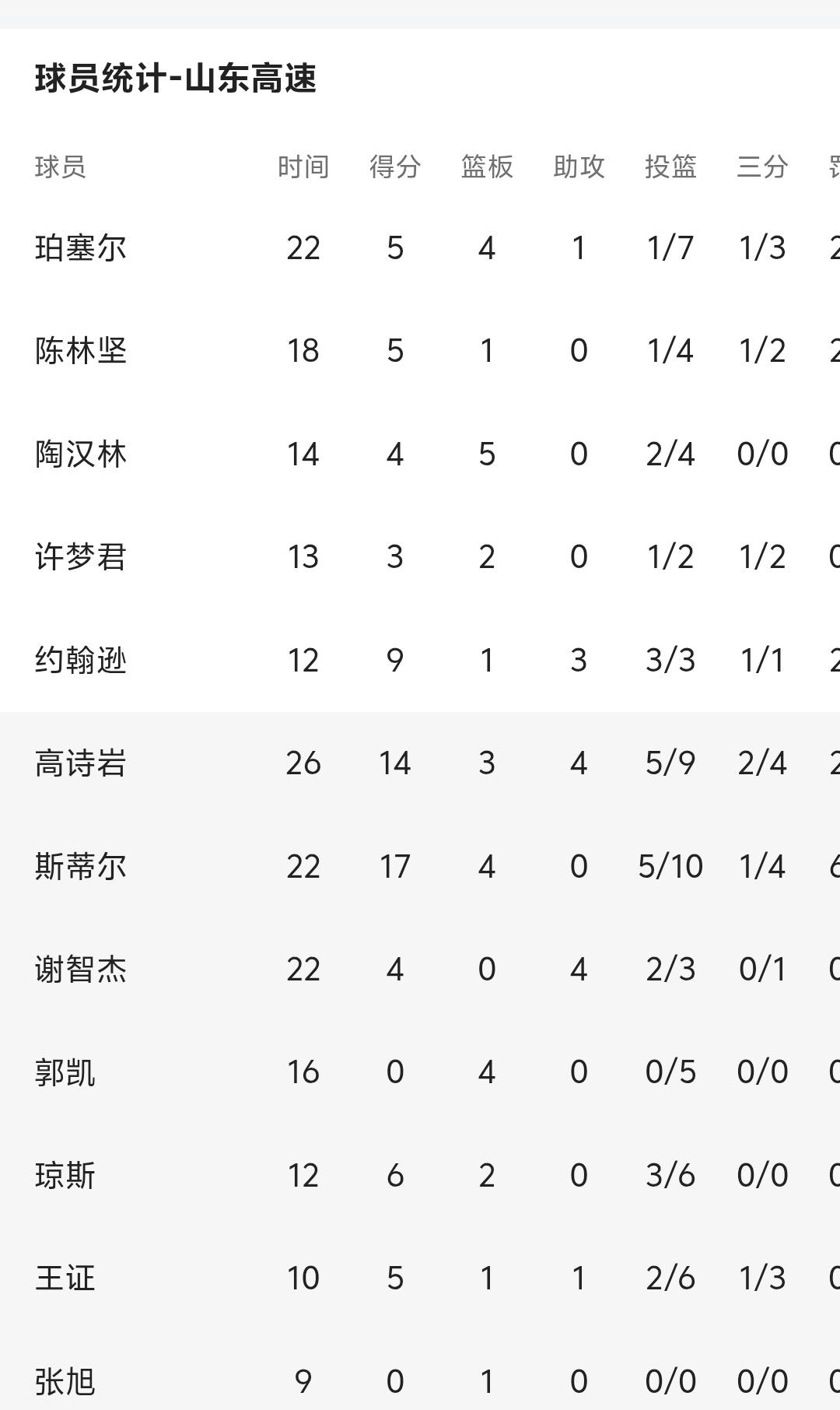 山东男篮得分最高的竟然是外援斯蒂尔的17分,然后就是高诗岩14分,除此之外没有人得分上双,而且篮板全队才29个!