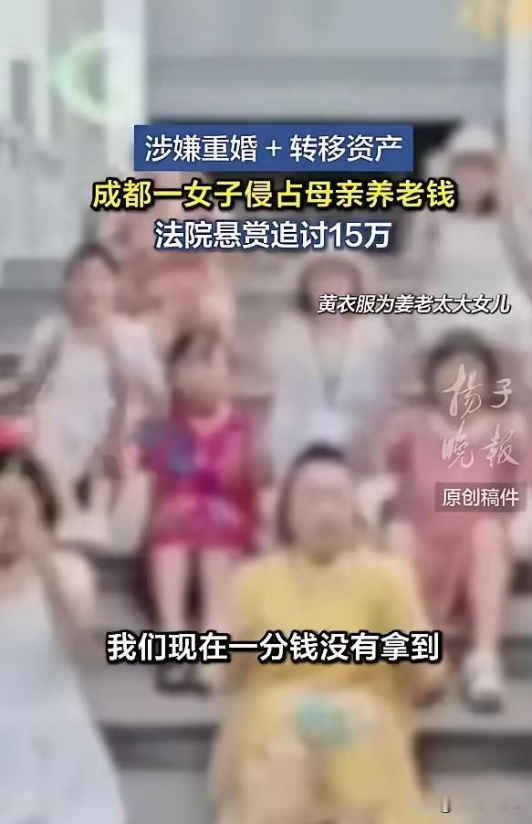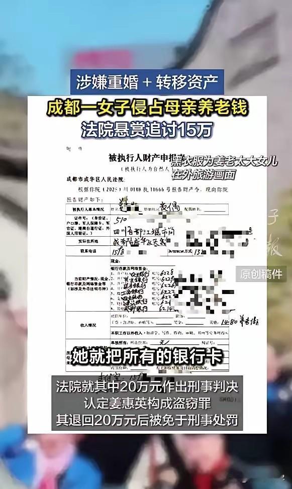四川成都,84岁老太被54岁未婚小女儿送进养老院,老太与前夫所生的大女儿,竟私自带走母亲,伪造假身份证盗取母亲35万元存款。小女儿作为监护人起诉后,大女儿仅归还20万,剩余15万拒不归还还转移财产。法院强制执行却查不到资金去向,还发现大女儿有6段婚姻、5段离异,且婚内重婚,追责受阻,最终法院发布悬赏公告追查。