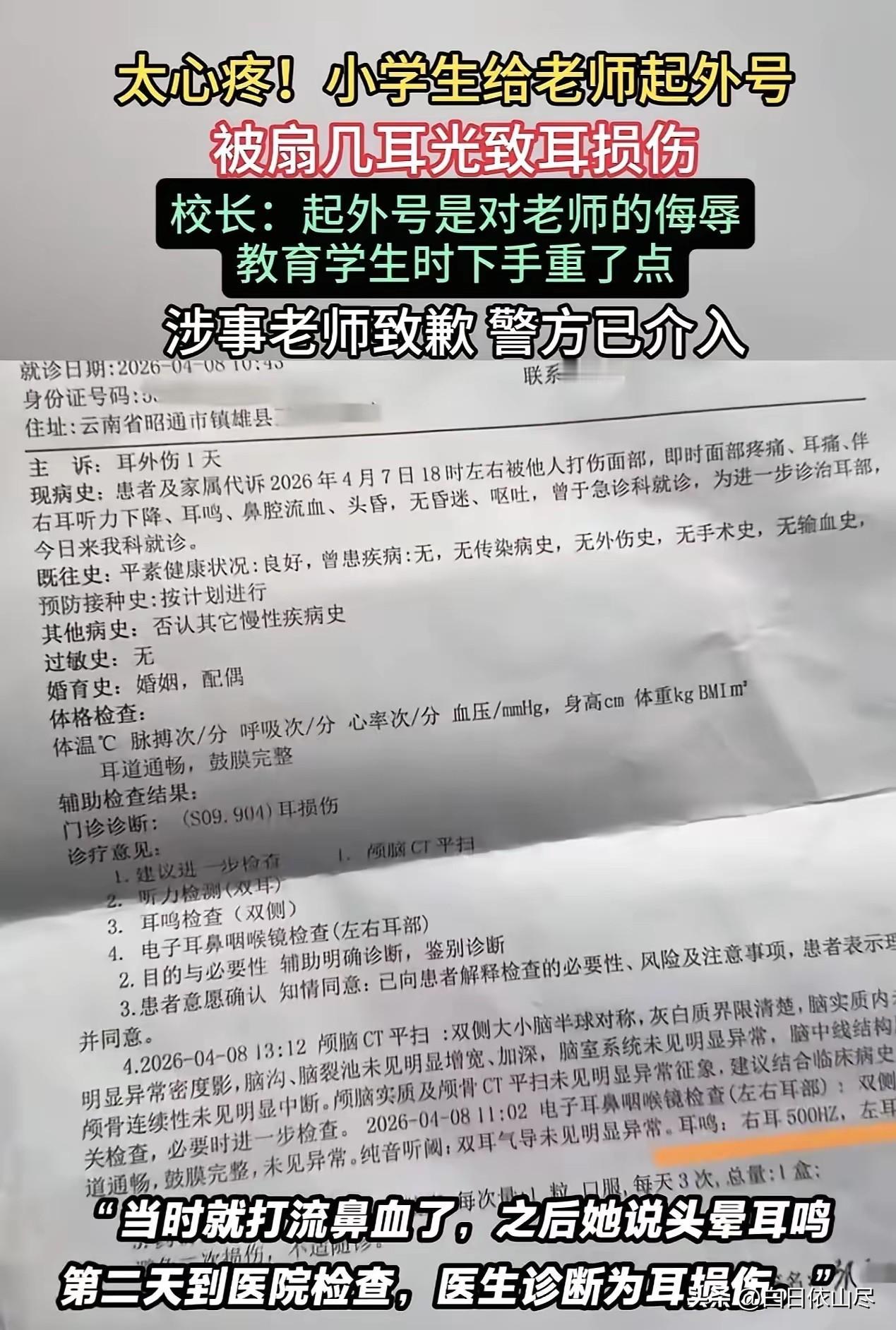 云南,一六年级女学生放学回家,说自己头晕耳鸣,家长发现孩子鼻腔有血迹,追问之下才得知,孩子竟被老师连扇了四个耳光,当场就流了鼻血,家长到学校质问,才得知是孩子给老师取了个难听的外号所致!