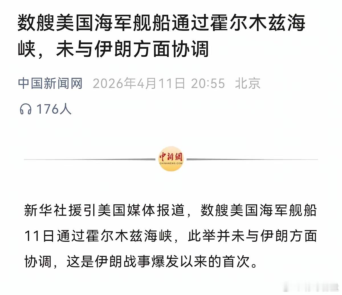 美军舰硬闯霍尔木兹海峡谈判还在谈,炮口已对准。4月11日,美伊在巴基斯坦谈判同一天,美军多艘舰船未经协调、直接通过霍尔木兹海峡,这是冲突爆发以来首次。一、危险信号:不打招呼、直接通行美军这次行动全程未与伊朗协调,等于无视伊朗对海峡的控制权主张。在军事上,这是高威慑、高风险的自由航行行动,相当于在谈判桌上直接拍桌施压。二、军事博主锐评:以压促谈,软硬双簧一边谈解冻资产、停火协议,一边派军舰闯海峡,美国在玩一手谈判、一手威慑的双簧戏。- 对伊朗:不满足条件,军事压力就不撤- 对国际:展示掌控力,稳定油价与盟友信心伊朗的底线正是完全控制霍尔木兹海峡,美军此举直接踩红线。三、局势走向:谈归谈,打归打谈判进程缓慢,美方急、伊朗稳,现在又加上军事挑衅,擦枪走火风险急剧升高。军舰过海峡不是和平姿态,是谈判筹码。一句话总结:嘴上谈和平,脚下动刀兵。这场中东博弈,远没到缓和的时候。