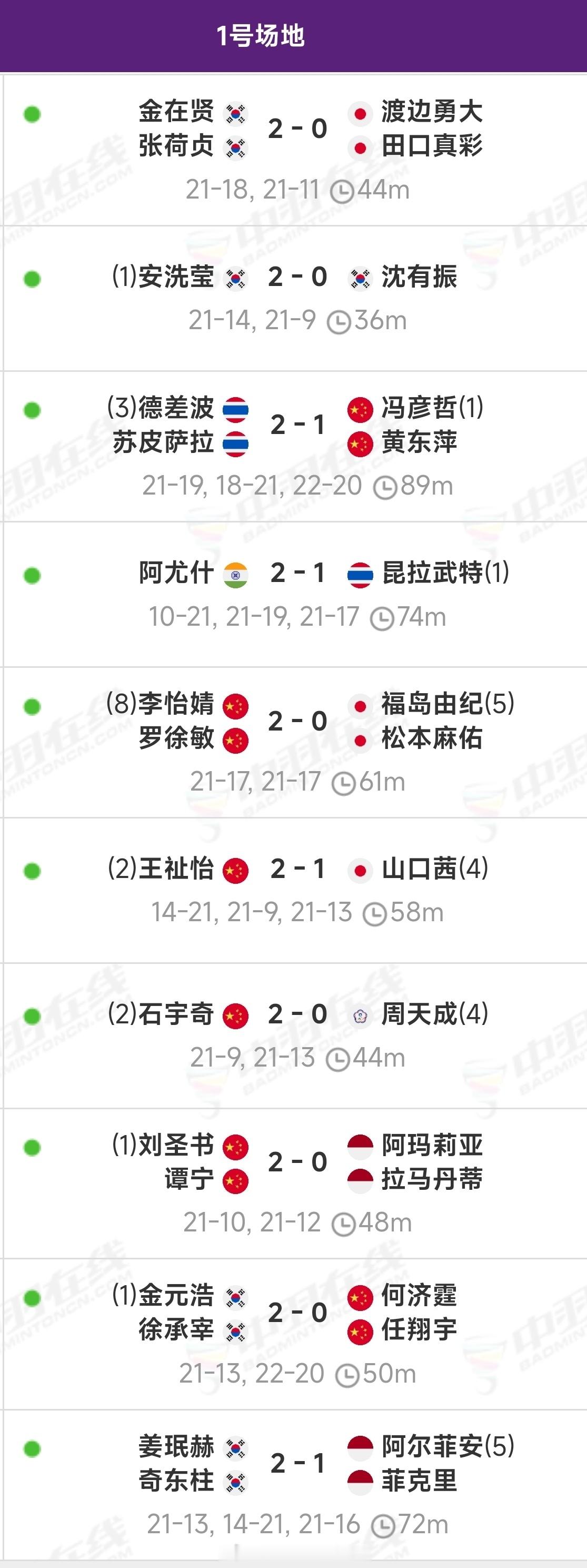 ❶ 王祉怡🇨🇳 vs 安洗莹🇰🇷(5-18)❷ 刘圣书/谭宁🇨🇳 vs 李怡婧/罗徐敏🇨🇳(10-1)❸ 金元浩/徐承宰🇰🇷 vs 奇东柱/姜珉赫🇰🇷(1-1)❹ 石宇奇🇨🇳 vs 阿尤什🇮🇳(2-0)❺ 德差波/苏皮萨拉🇹🇭(退赛)vs 🏆金在贤/张荷贞🇰🇷