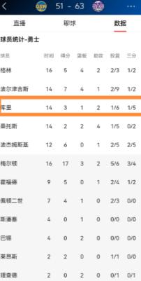 投篮6中1,其中三分球5中1,只拿到3分,还出现了2次失误,场上正负值为-2。
