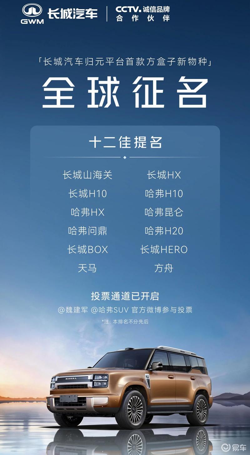易车讯4月11日,长城哈弗旗下全新方盒子新物种车型全民征名活动进入新阶段,经过全网征集、筛选与评审,十二佳命名提名正式公布,并同步启动全民投票环节。