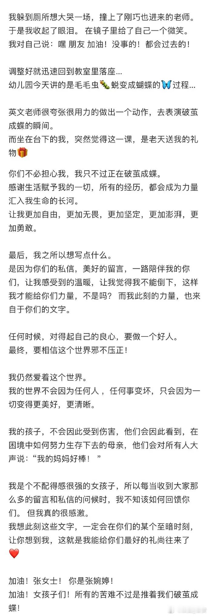 宋宁峰出轨风波后张婉婷首发长文。她在文中写:“我仍然爱着这个世界。我的世界不会因为任何人 ,任何事变坏,只会因为一切变得更美好,更清晰。我的孩子,不会因此受到伤害,他们会因此看到,在困境中如何努力生存下去的母亲,他们会对所有人大声说我的妈妈好棒! ”张婉婷称:“那天幼儿园开放日,要有家长的陪伴。手机的信息快要炸了,是朋友们的关心和安慰。我迟到了,所以我偷偷摸摸跑去最后一排陪上课…恩娜执意要我坐在她身后,我就穿过家长,坐到了她身后。她一边听课,一边偷偷伸出手递给我,悄悄说:“妈妈牵着我的手”那一刻我真的绷不住了,因为有一屋子的家长,和正在占据新闻热搜的我… 我不免觉得有些不安…我努力的克制,可是眼泪就是忍不住的喷涌… 我压低了帽檐… 迅速擦掉眼泪…你们不必担心我,我只不过正在破茧成蝶。感谢生活赋予我的一切,所有的经历,都会成为力量汇入我生命的长河。我是个不配得感很强的女孩子,所以每当收到大家那么多的留言和私信的问候时,我不知该如何回馈你们。 但我真的很感激。”
