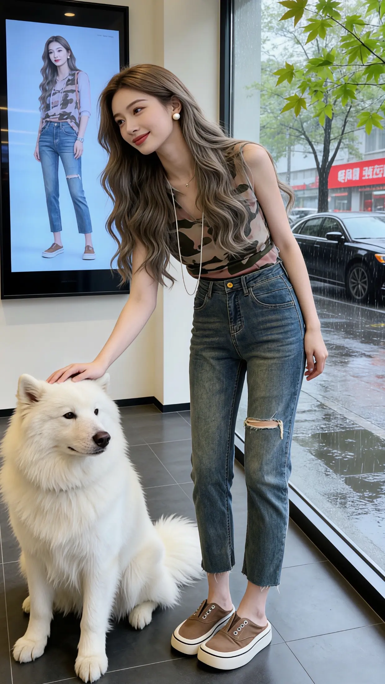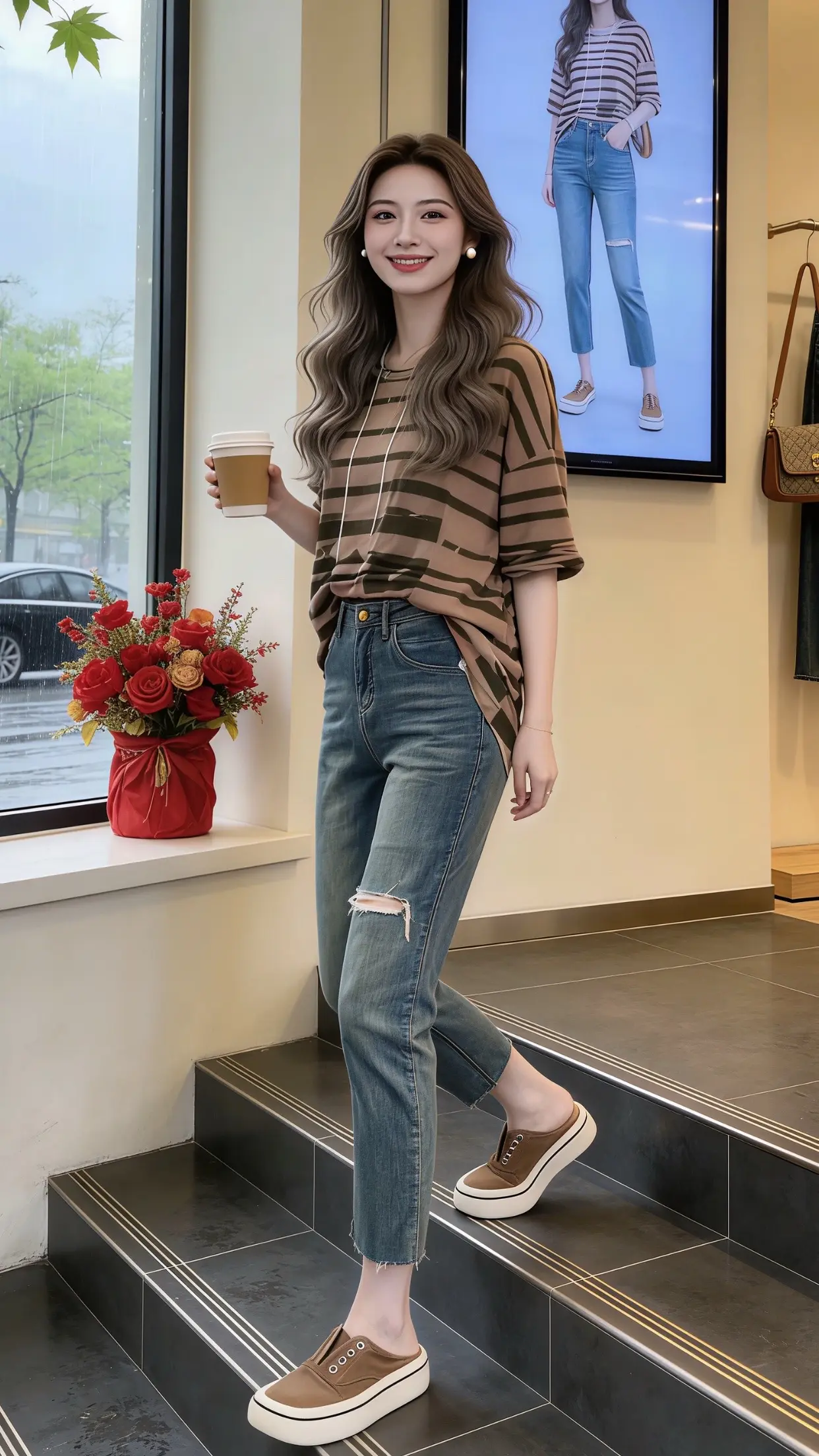 雨后的石板路泛着清润的光,她就站在那里,一身浅蓝色喇叭牛仔裤,把利落与温柔揉得刚