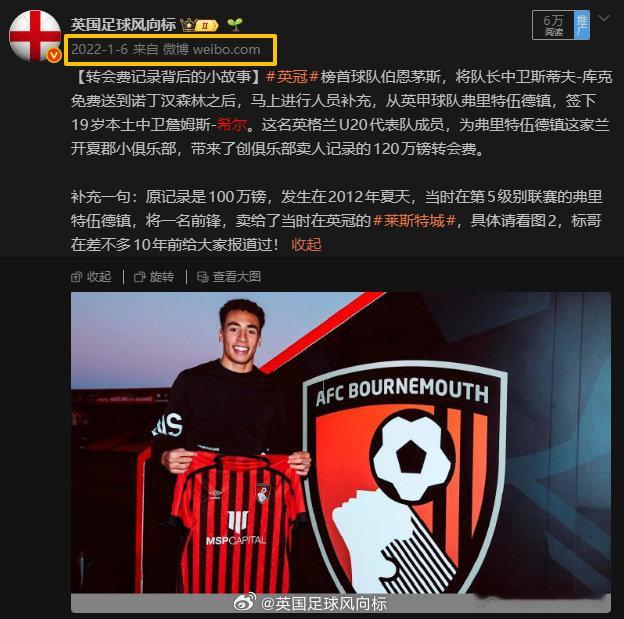 【小投资大回报!英超球队刮刮奖真实案例】2022年1月冬窗,伯恩茅斯从英甲弗里特伍德镇,签下19岁本土中卫詹姆斯-希尔,转会费为120万英镑。弗镇非常高兴完成交易,因为打破了他们俱乐部卖人的转会费记录。这笔交易当时很少人关注,标哥有做过相关报道。
