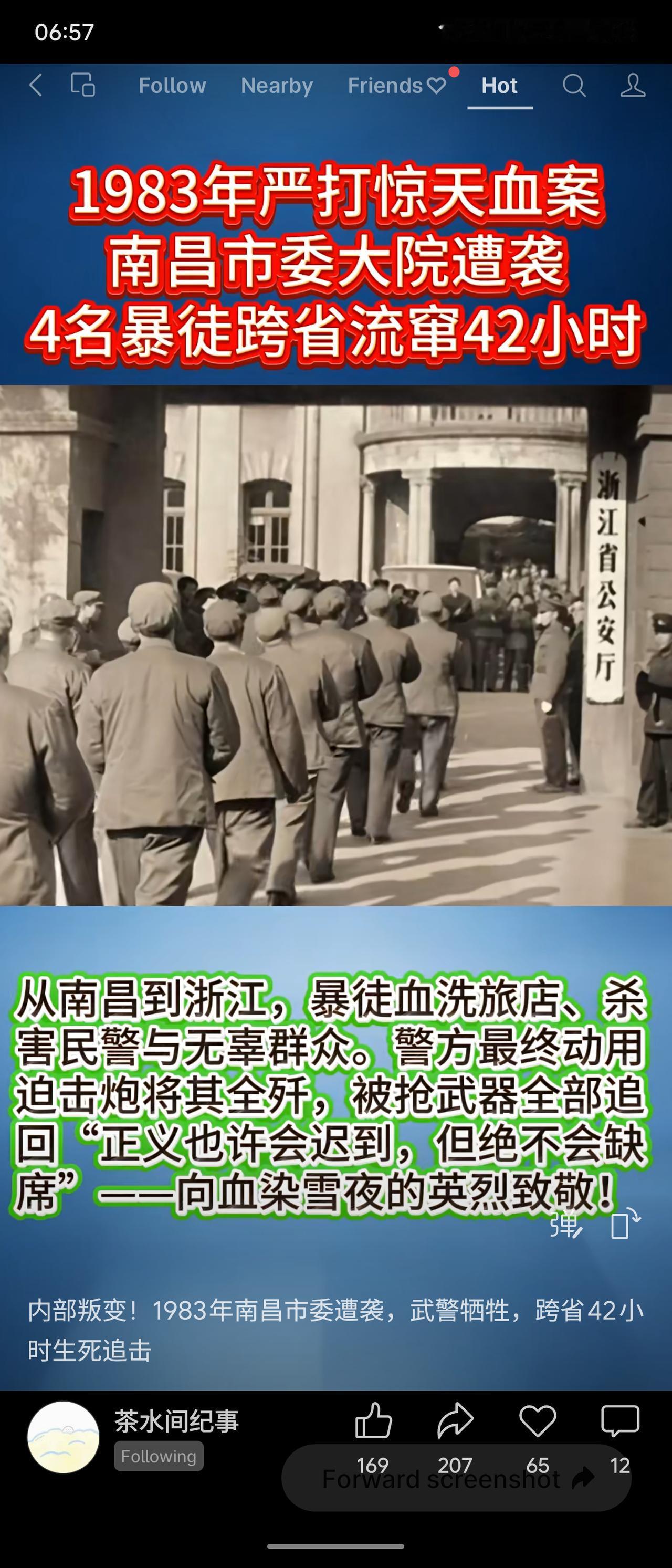 1983年严打期间,南昌市委大院发生血案:武警哨兵胡大兰被内部叛徒杀害,5支手枪、2支冲锋枪及2417发子弹被抢。4名暴徒驾车冲撞学生,跨省流窜42小时,沿途血洗旅店、杀害民警与群众。警方最终动用迫击炮将其全歼,被抢武器全部追回。
