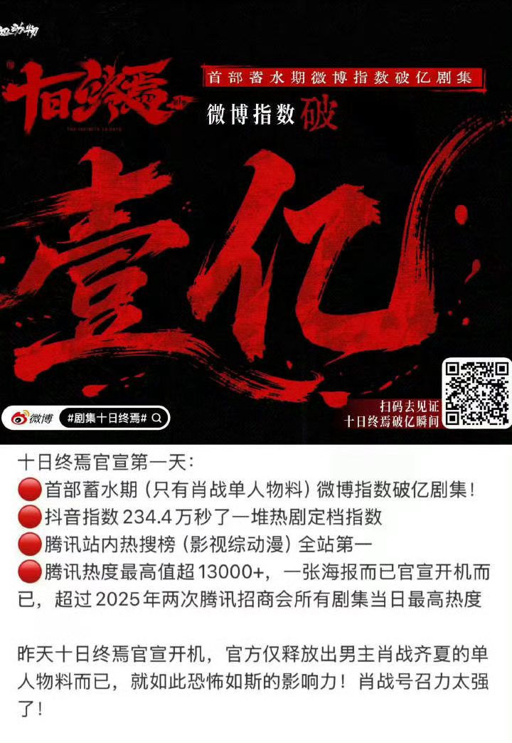 肖战这个有点太牛,《十日终焉》开机第三天,36个小时仅肖战齐夏单人物料就有两个破亿!肖战十日终焉微指破亿