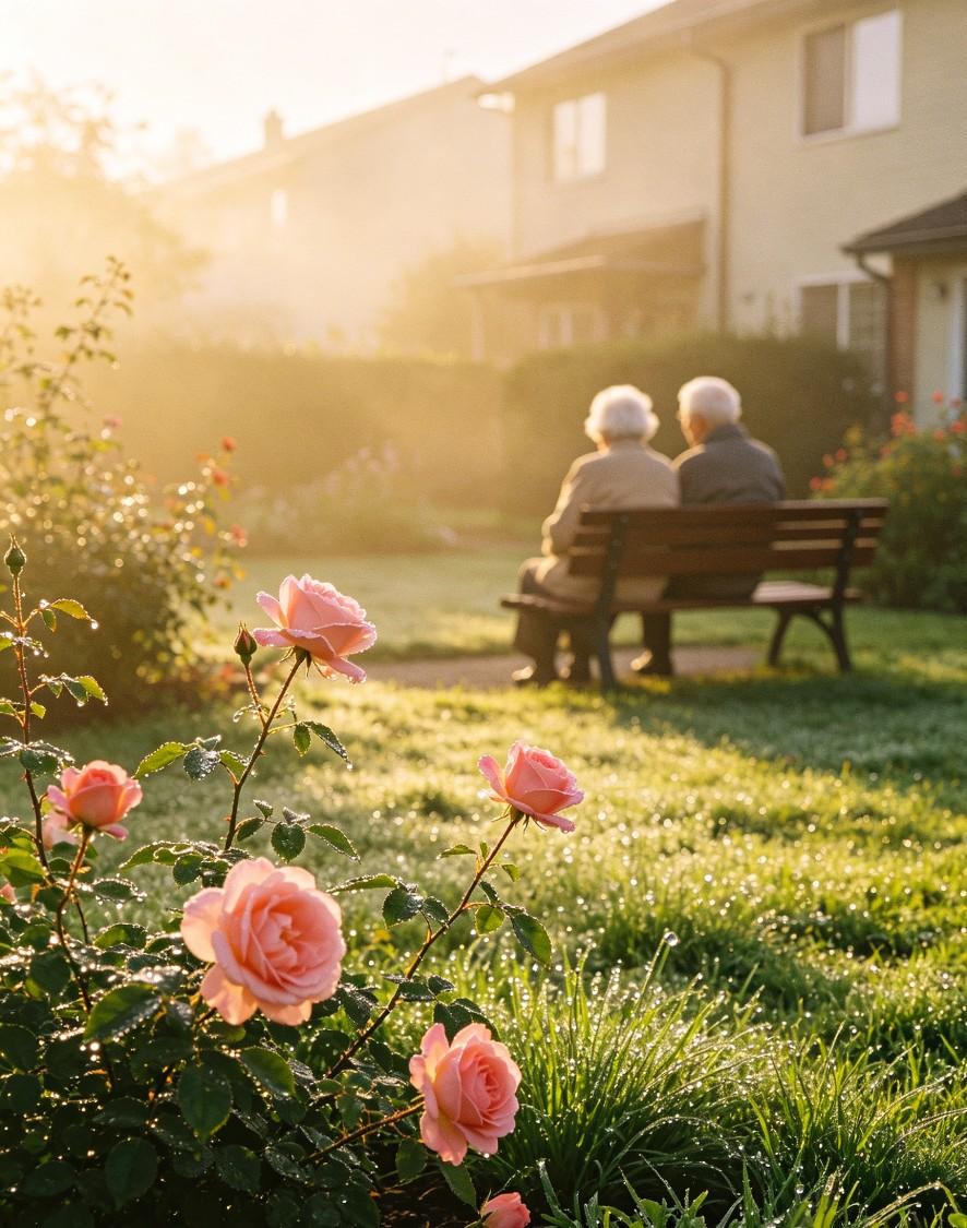 打扫卫生的大姐一边扫地一边哼着小曲,遛狗的大爷慢悠悠走着,长椅上一对老人并排坐着,一句话不说,就那样晒着清晨的光。