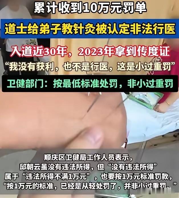 四川南充,一位61岁的老道爷,因为教徒弟针灸,被人举报非法行医,罚了5万。老头气不过,外出云游去了,结果罚款没交,又给加了5万,变成十万了!他这才急了眼,赶紧去申请复议,说罚得太重。