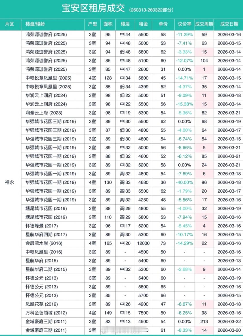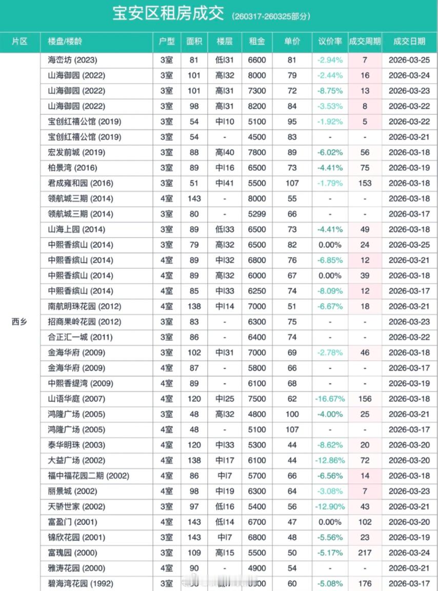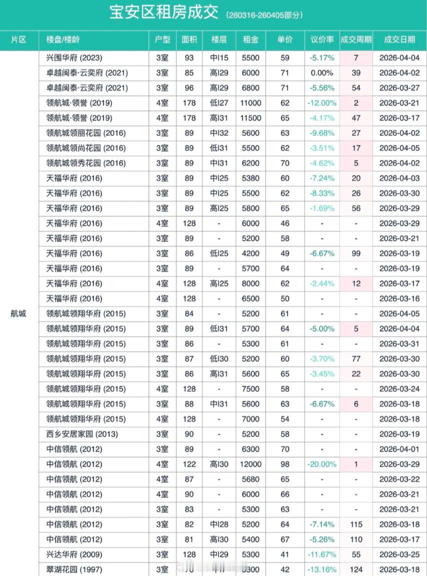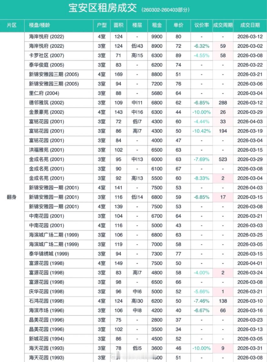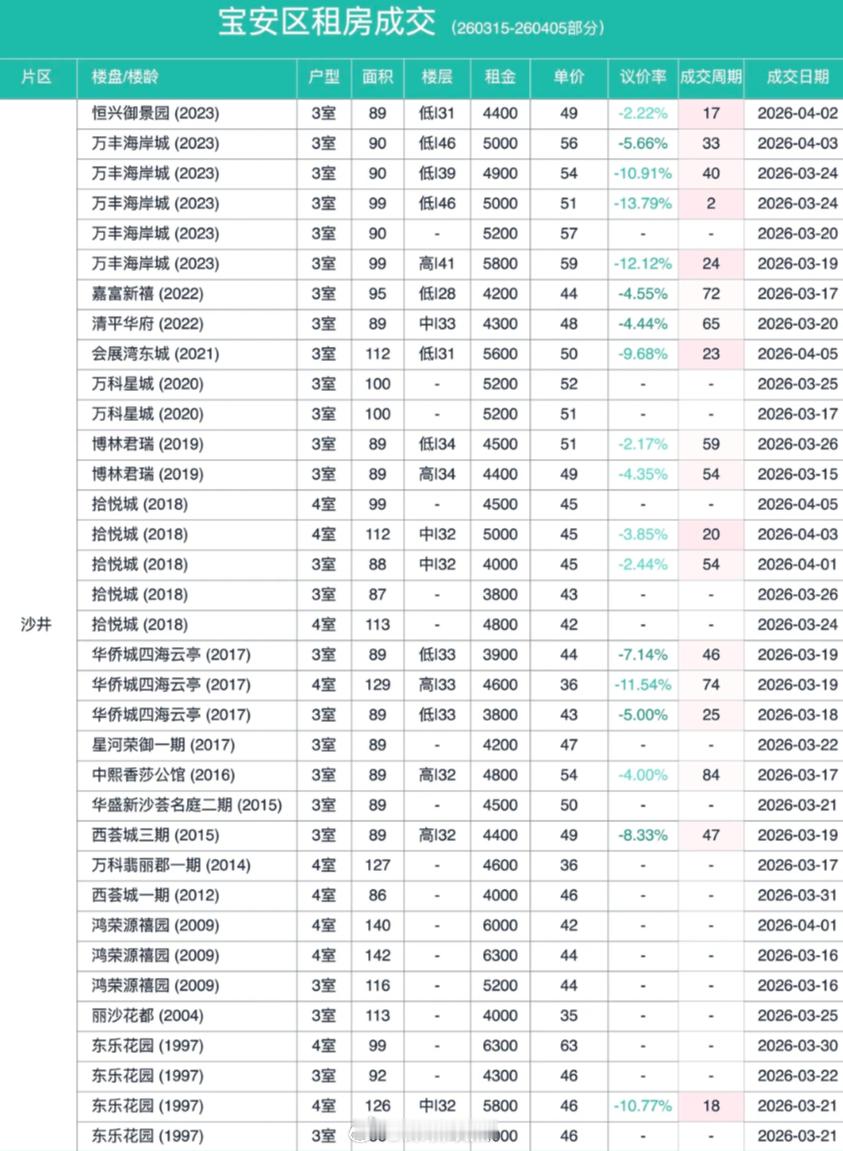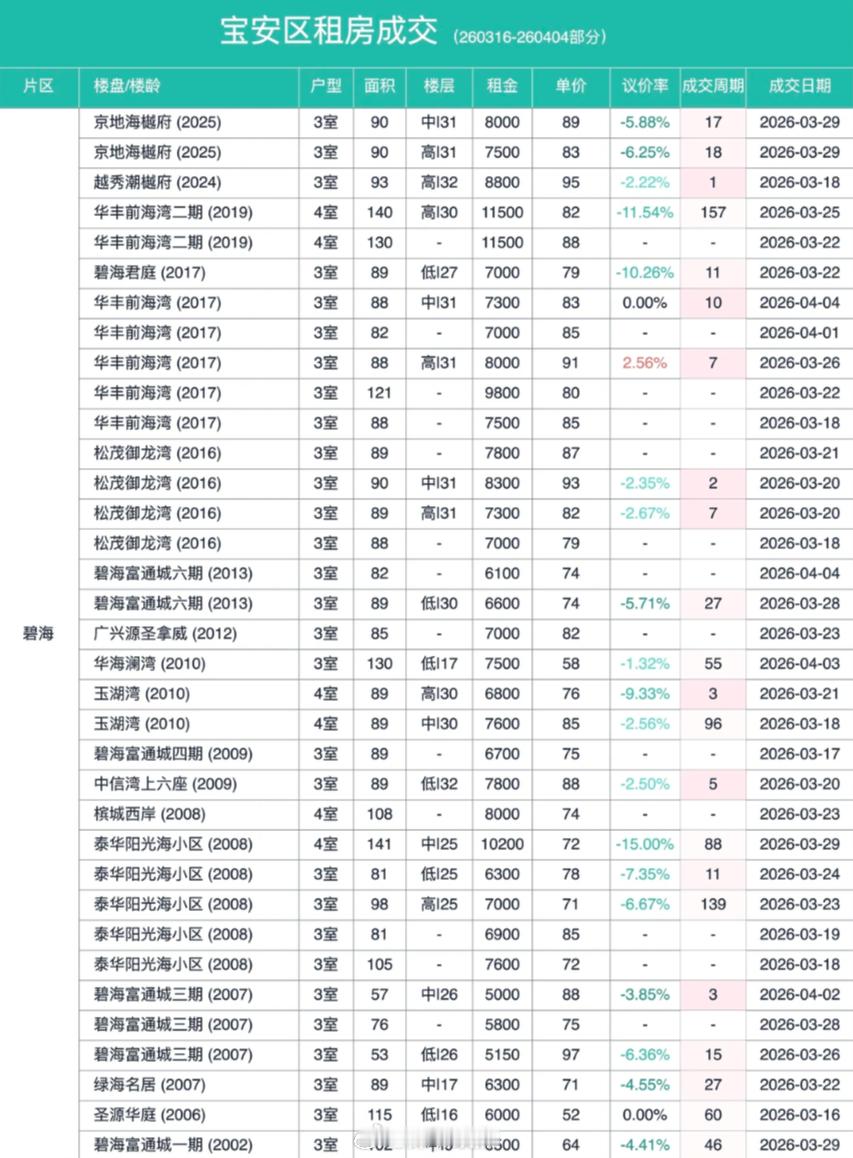 深圳宝安租房成交数据,3-4房的。宝中最好租的还是海纳公馆,89平3房,租金10
