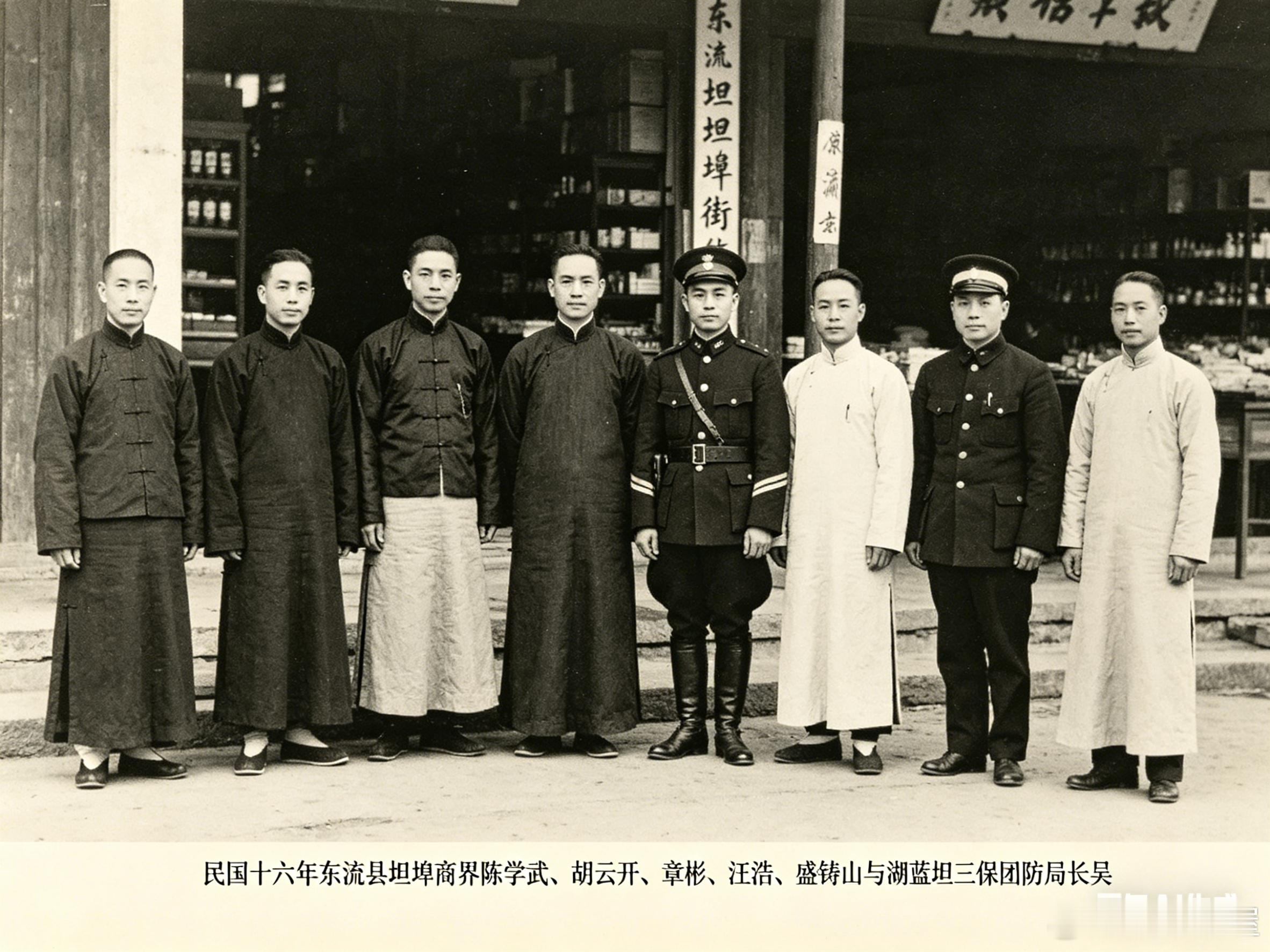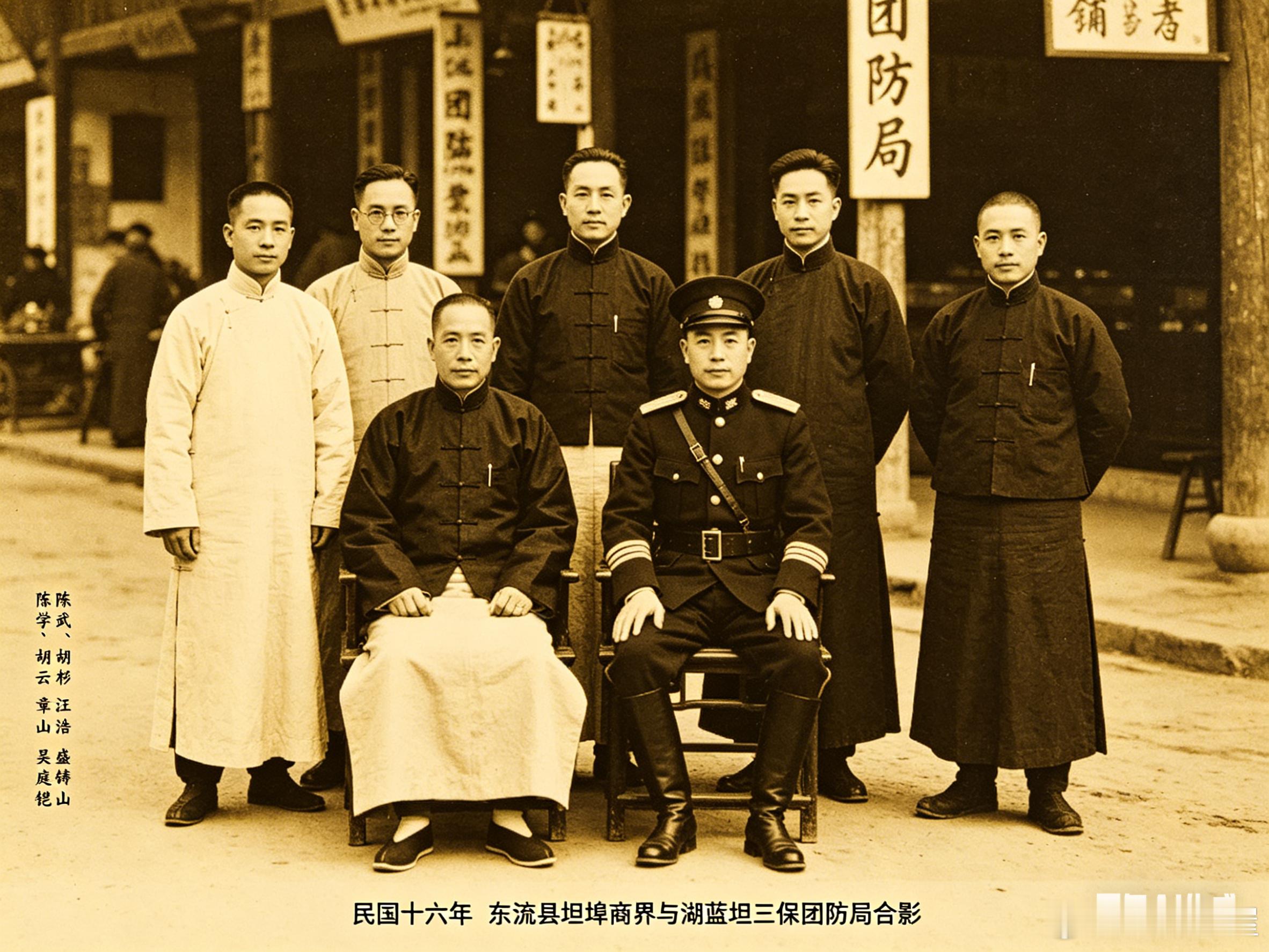 今日首发:东流县坦埠商界及军人合影;民国十六年东流县坦埠商界陈学武、胡云开、章彬、汪浩、盛铸山以及东流县湖蓝坦三保团防局长吴庭铠