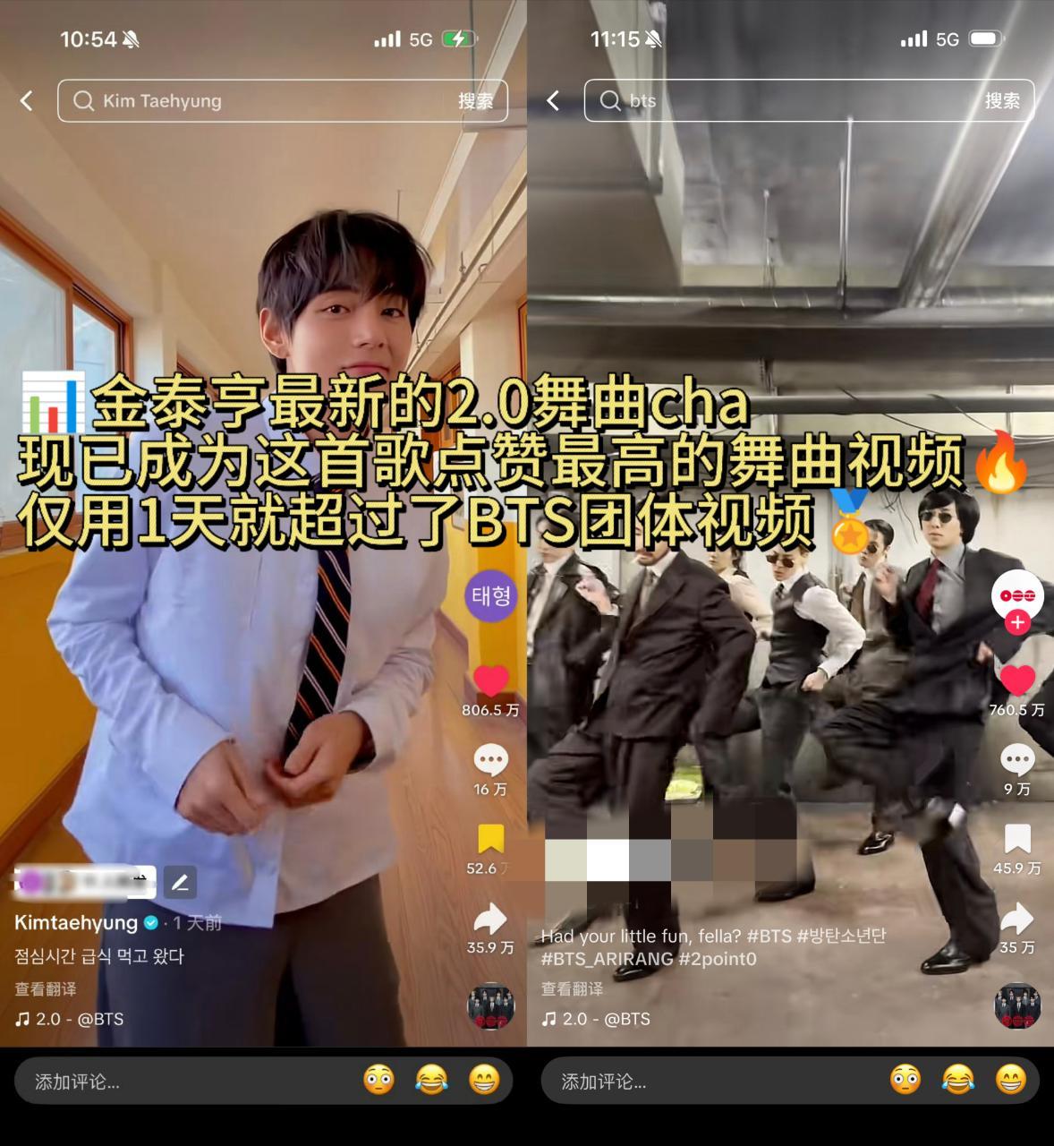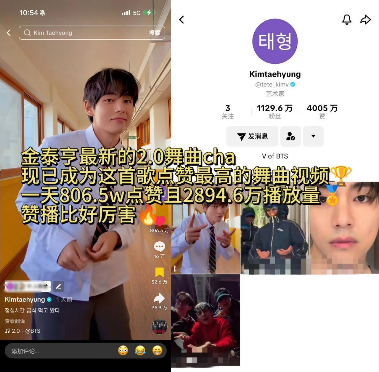 金泰亨最新的2.0舞曲cha现已成为这首歌点赞最高的舞曲视频,仅用1天就超过了B