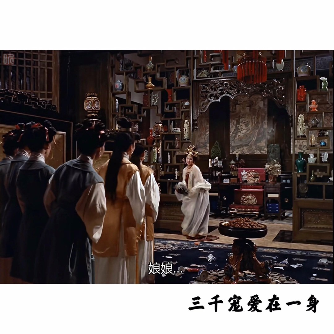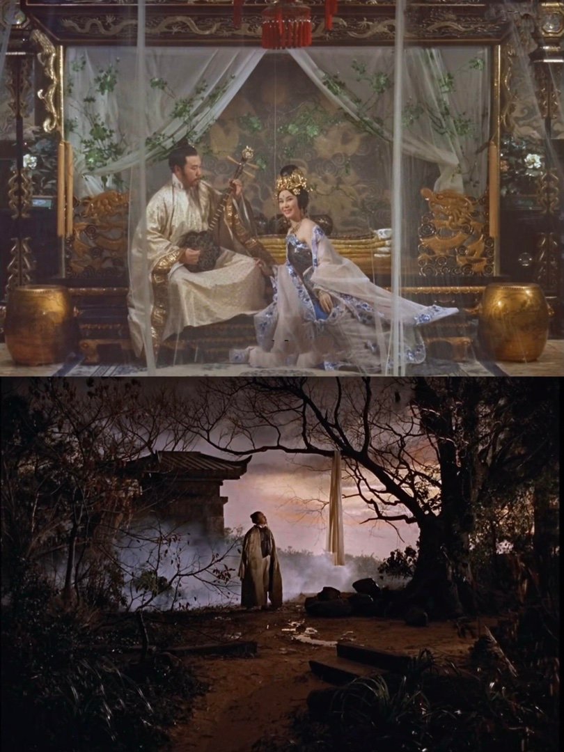 中国香港邵氏于五六十年代出品了一大批彩色古装片,满载了南下影人对中原故土的文化乡愁,堪称是一场场寄于胶片之上的寻根之旅。这其中最具代表性的,一类是黄梅调电影,以《江山美人》、《梁山伯与祝英台》为代表,宛转蕴藉,深具古典情致;一类是古装宫闱巨制,以《杨贵妃》、《武则天》领衔,力图在“电影胶片中建立金碧辉煌的梦幻中国”。这两类古装片均由传奇导演李翰祥一手开拓,以上提到的几部亦是他的早期代表作。以《杨贵妃》为例,虽然片中的唐宫里坊、家具陈设都糅入了大量的明清审美,仅属意象派的唐风幻想。但全片置景之华美辉煌,细节之繁冗富丽,仍堪称前无古人,也为后来者树立了标杆。尤其在六十年前能以邵氏片场弹丸之地搭出如此巨构,更显出导演天才的创造力。杨妃出浴时脚踏珠光璀璨的胡鞋,翠华西阁有缀满梅花的螺钿屏风和纱幔;长生殿里芙蓉帐,华清宫中莲花汤;还有顶天立地的多宝阁,仿自敦煌的纹样。今人观之,虽明知其“假”(朝代混搭)其“俗”(世俗趣味),仍觉假得够真,俗得够雅。唐宫大殿仙乐飘飘,马嵬破庙青灯寂寂。士兵于天王像下振臂一呼,贵妃在大雄殿前决然赴死,明皇对枯枝白绫黯自神伤,构图均极富画意。李翰祥出身北平艺专,师从徐悲鸿、吴作人,艺术底蕴于此可见一斑。李翰祥凭此片第二度入围戛纳主竞赛,同场对手包括雷伊、瓦尔达、布列松、布努埃尔和安东尼奥尼等名导。在影片题材、拍摄手法毫无优势,甚至让人有“走错场”之感的情形下,以73分钟的袖珍体量惊喜斩获技术大奖。《杨贵妃》也成为史上第一部在戛纳获奖的华语片,可见李氏古典美学对欧洲影圈展现出的压迫性魅力。