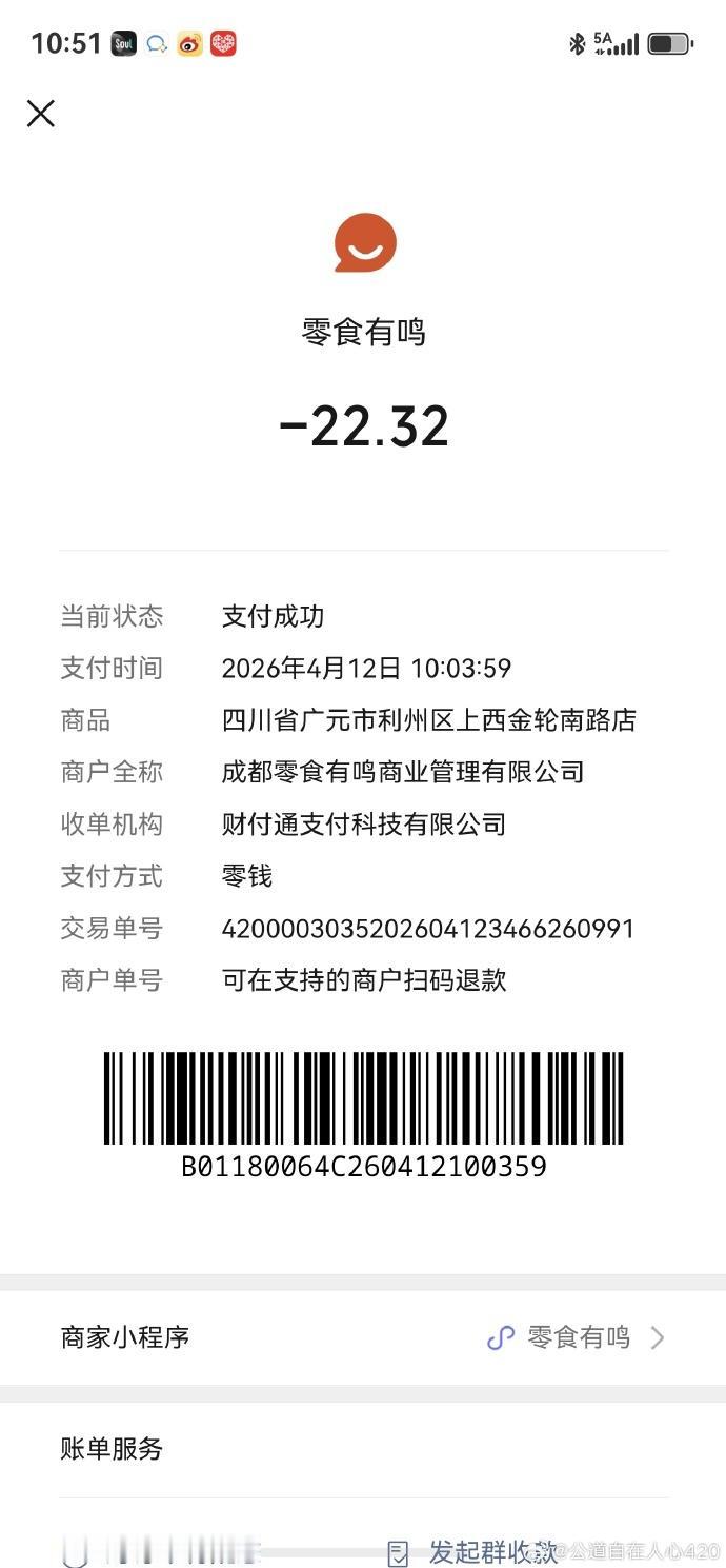 并晒出了付款码!】4月12日,四川广元。网友(公道自在人心420)发布,在零食有鸣品买到的肉肠竟有异物,并晒出了付款码。原文如下: