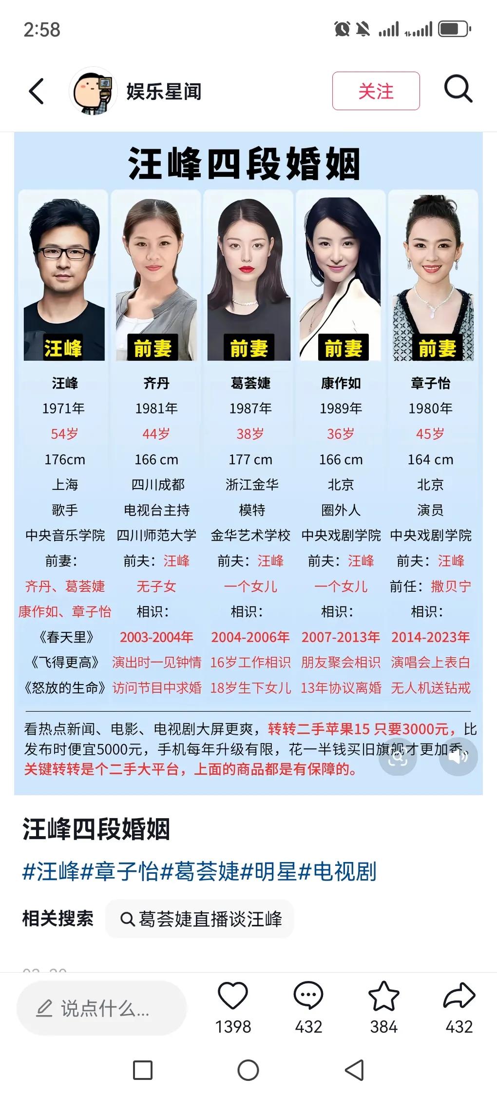 汪峰这情史真是一部精彩大戏。他有过四个前妻,每段感情都各有故事。第一任齐丹,为他放弃主持工作来北京,可婚姻仅维持一年就散了。之后和超模葛荟婕未婚生女“小苹果”,又因她贪玩分手。第三任康作如也没能和他长久。