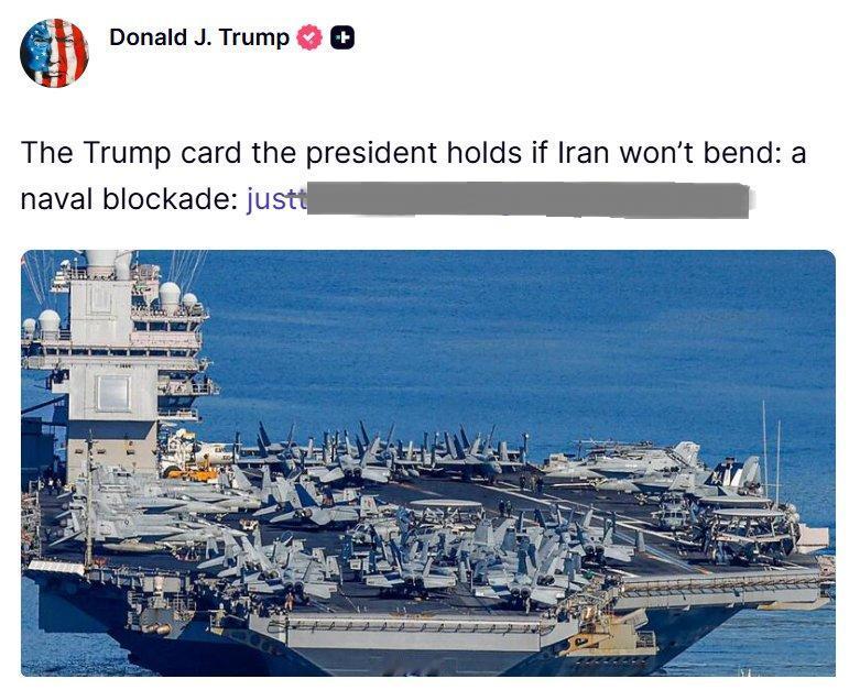 特朗普在与伊朗和平会谈失败后的第一条社交媒体帖子是一个链接,指向一篇文章,该文章暗示如果伊朗不遵守美国的要求,对伊朗实施海上封锁。
